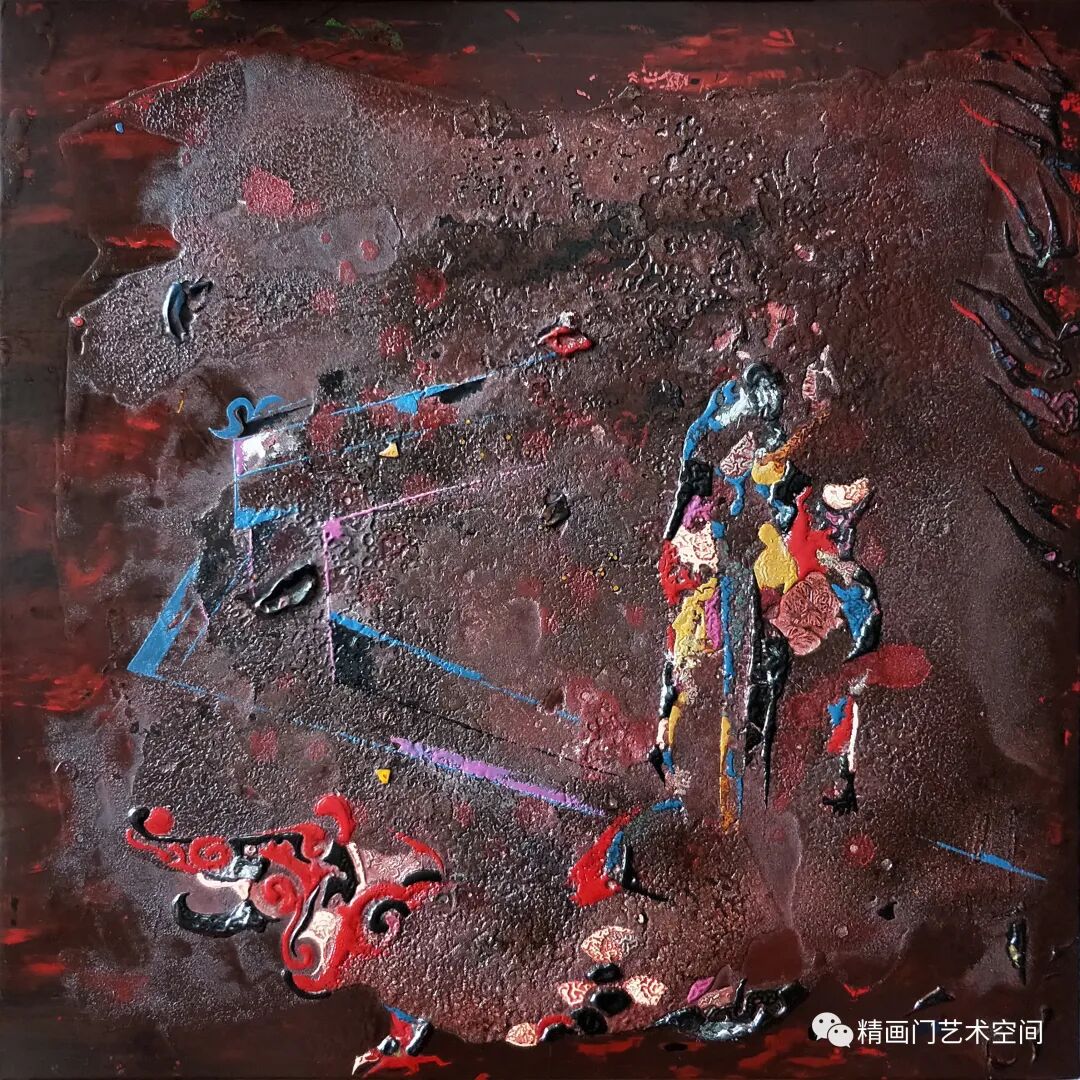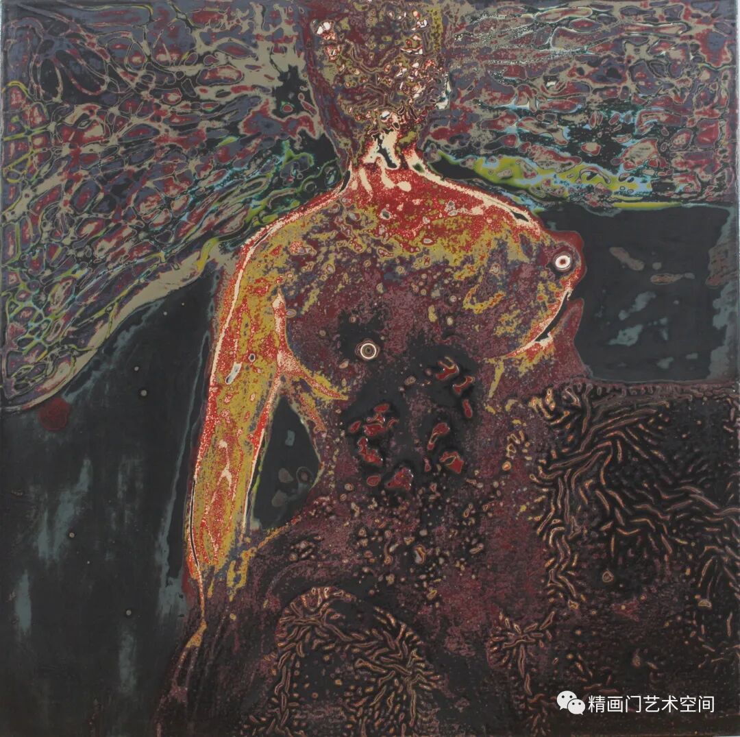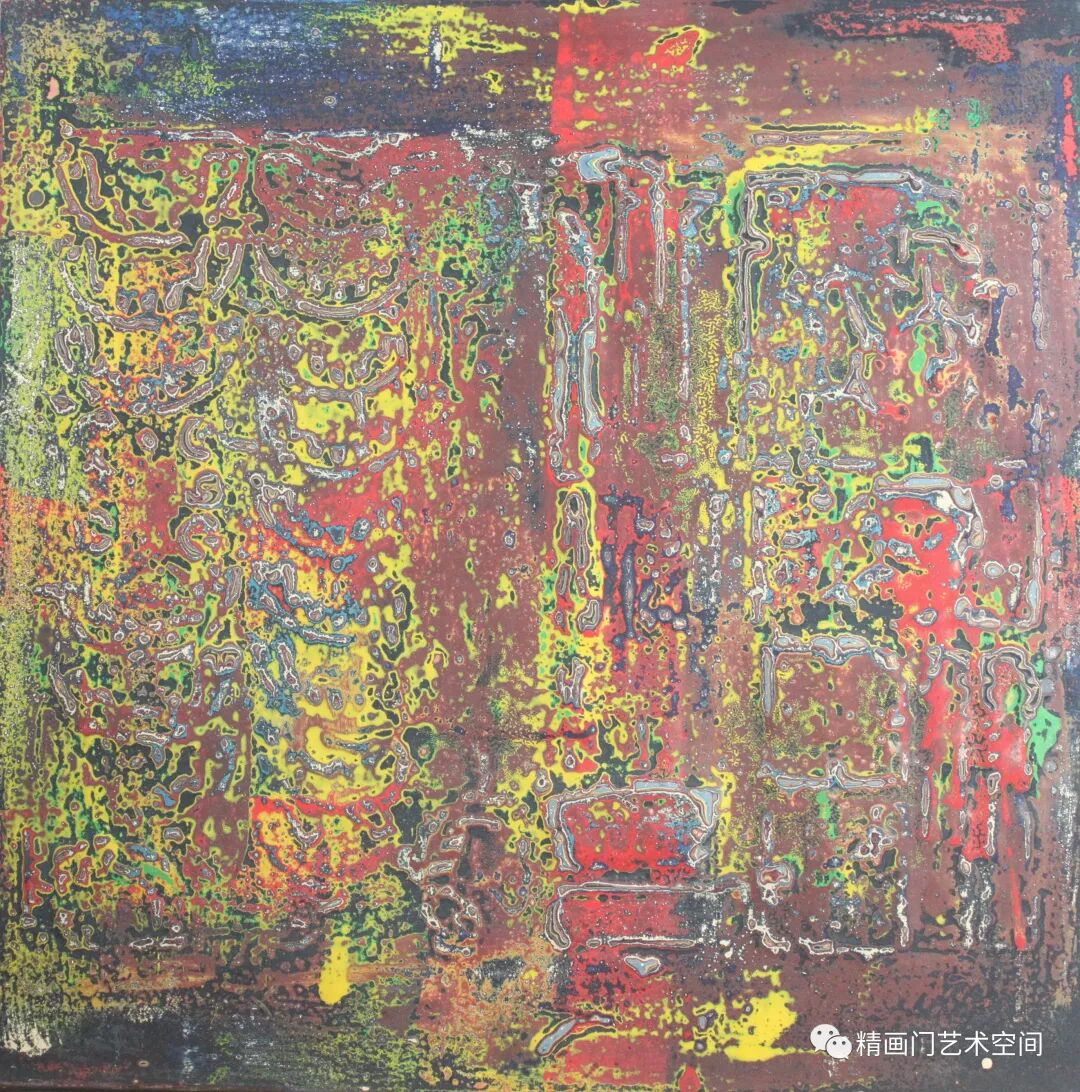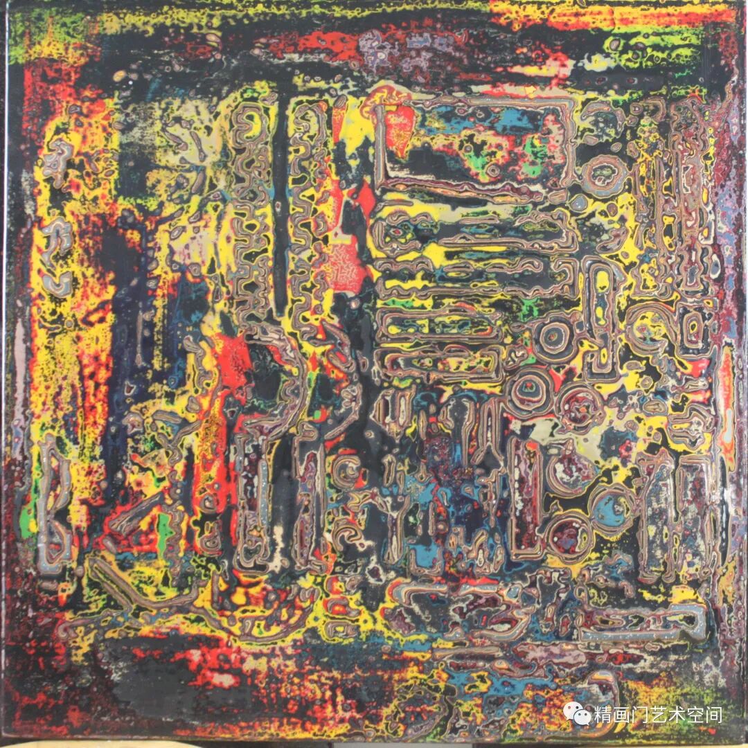 作者创作侧重绘画语言的实验与探索,媒材的肌理与线条是其认识世界的方式,运用隐喻的色彩,藉由髹漆形成丰富的细节和微妙的色彩变化。《混沌的二重奏》《春潮系列》以象征性的手法杂糅、斑驳的视觉肌理、线条的灵性,让观者产生一种迷幻的联想,这极为符合他对整个混沌世界情绪和氛围的渲染。造型、色彩,皆已冲出客观事物自然形态的具体规定,大大地淡化了艺术创造和艺术审美的传统,有时甚至最终取消了创作规律对于其的必要制约,用感性的线性书写与理性的序列排列相结合,进行秩序重构,保留了气质上微妙的连贯性,表露出东方气象,构成了一种人类命运的提示。