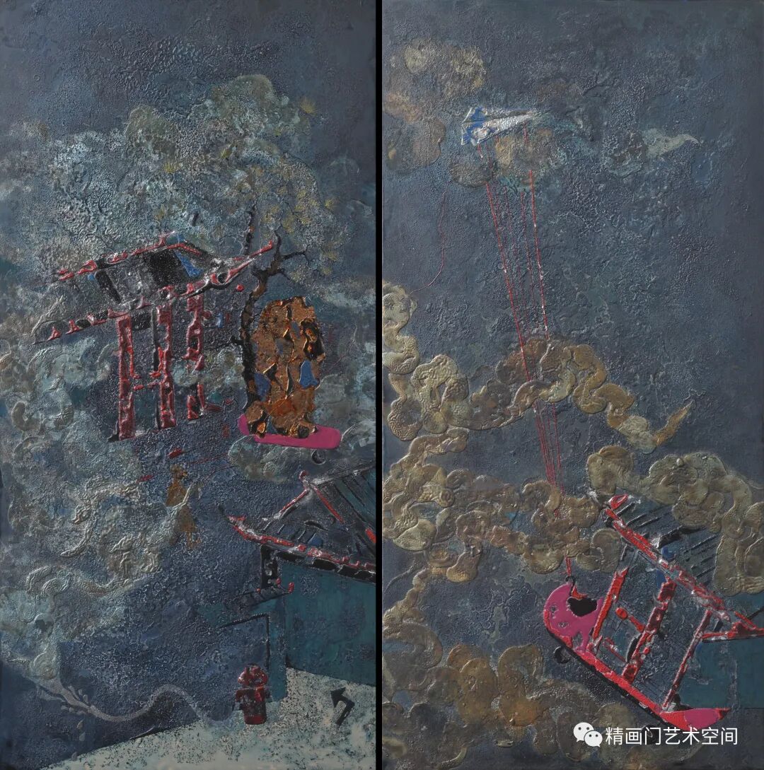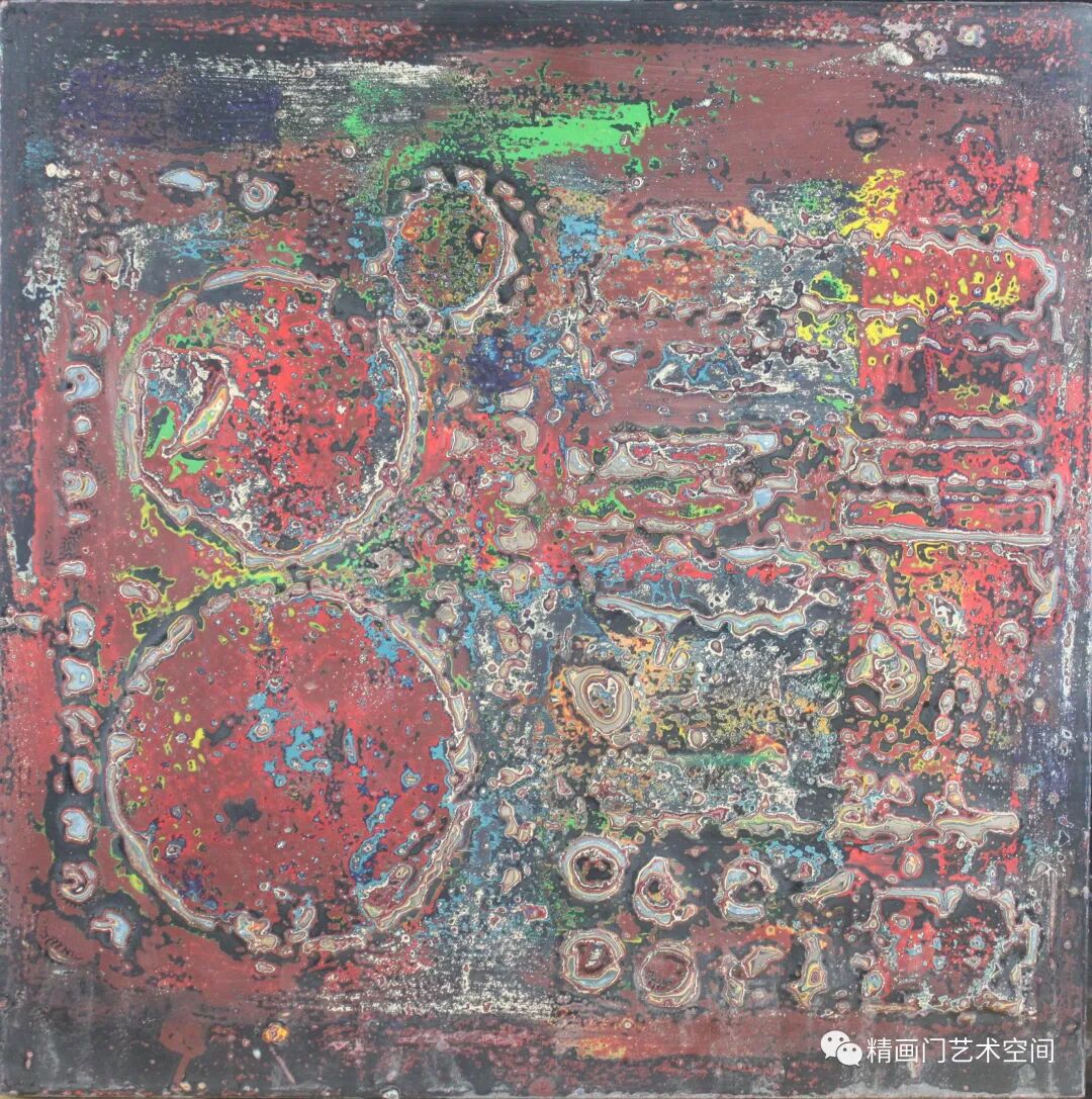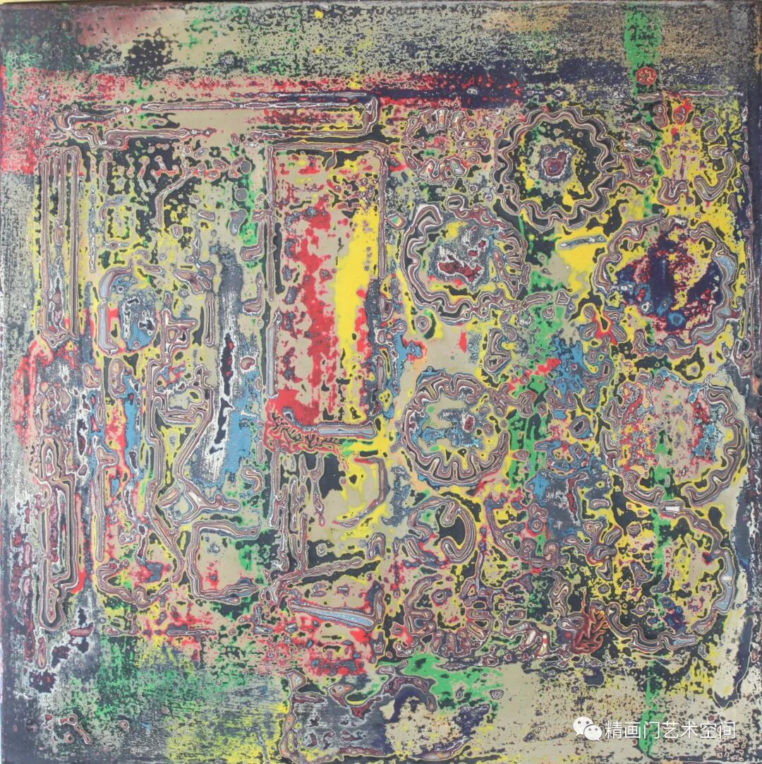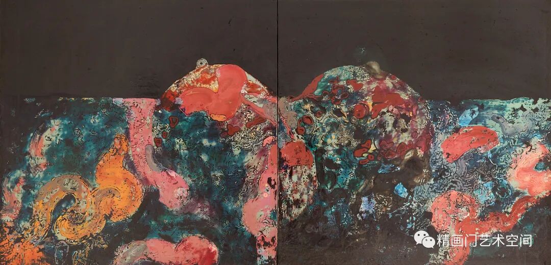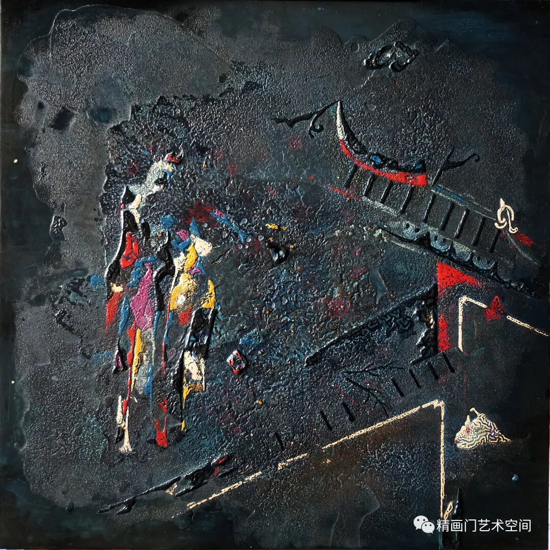 作者创作侧重绘画语言的实验与探索,媒材的肌理与线条是其认识世界的方式,运用隐喻的色彩,藉由髹漆形成丰富的细节和微妙的色彩变化。《混沌的二重奏》《春潮系列》以象征性的手法杂糅、斑驳的视觉肌理、线条的灵性,让观者产生一种迷幻的联想,这极为符合他对整个混沌世界情绪和氛围的渲染。造型、色彩,皆已冲出客观事物自然形态的具体规定,大大地淡化了艺术创造和艺术审美的传统,有时甚至最终取消了创作规律对于其的必要制约,用感性的线性书写与理性的序列排列相结合,进行秩序重构,保留了气质上微妙的连贯性,表露出东方气象,构成了一种人类命运的提示。