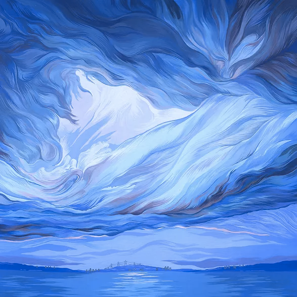 从自然界中获得灵感,并将它们转化成令人惊叹的插画作品,插画家的意图是希望通过烟、云和水的运动,来表现我们生存的世界,让人们重新审视自身,重新认识自然的力量。