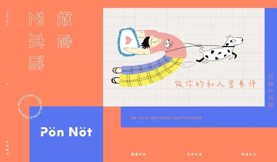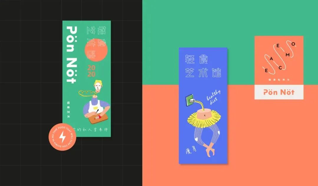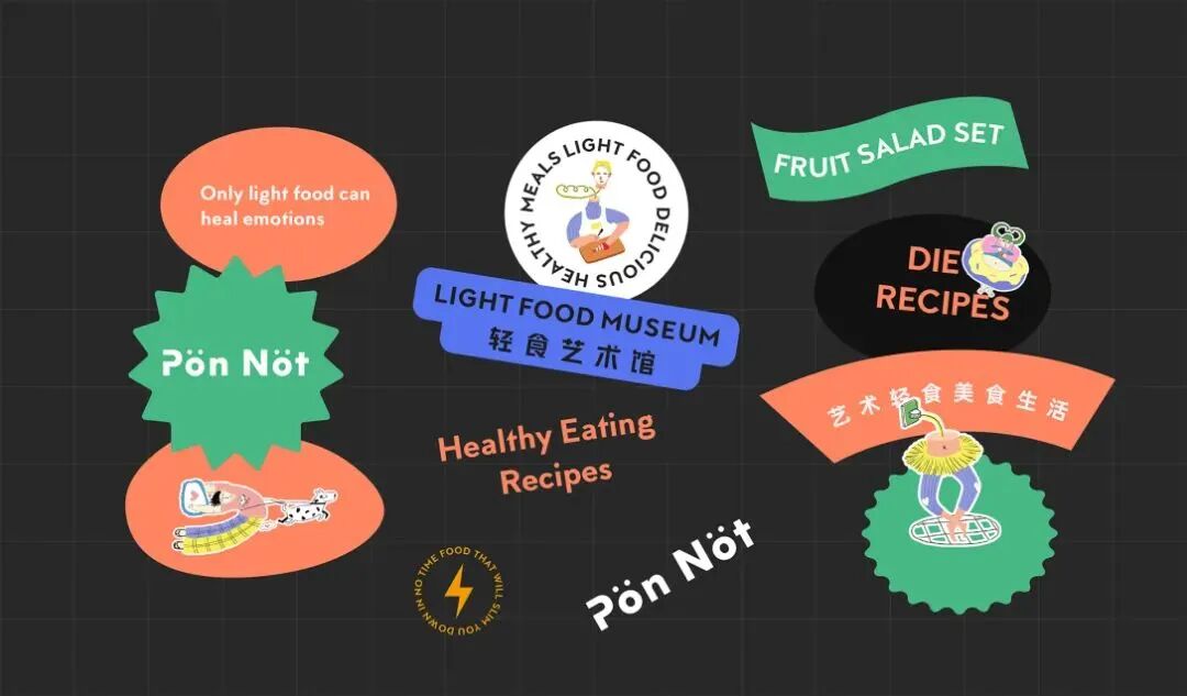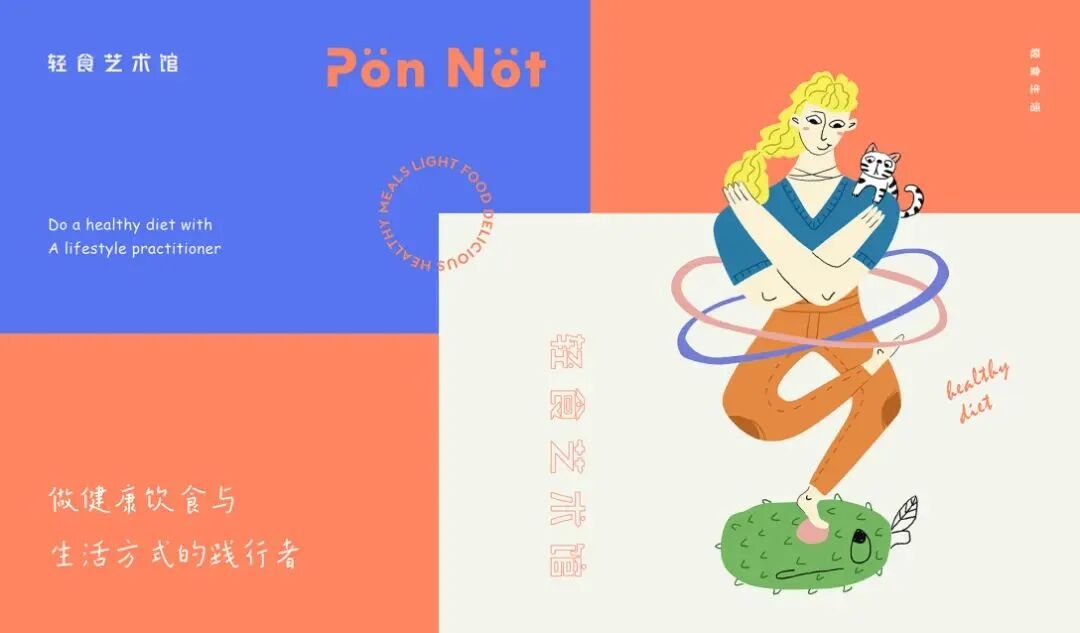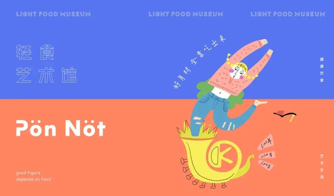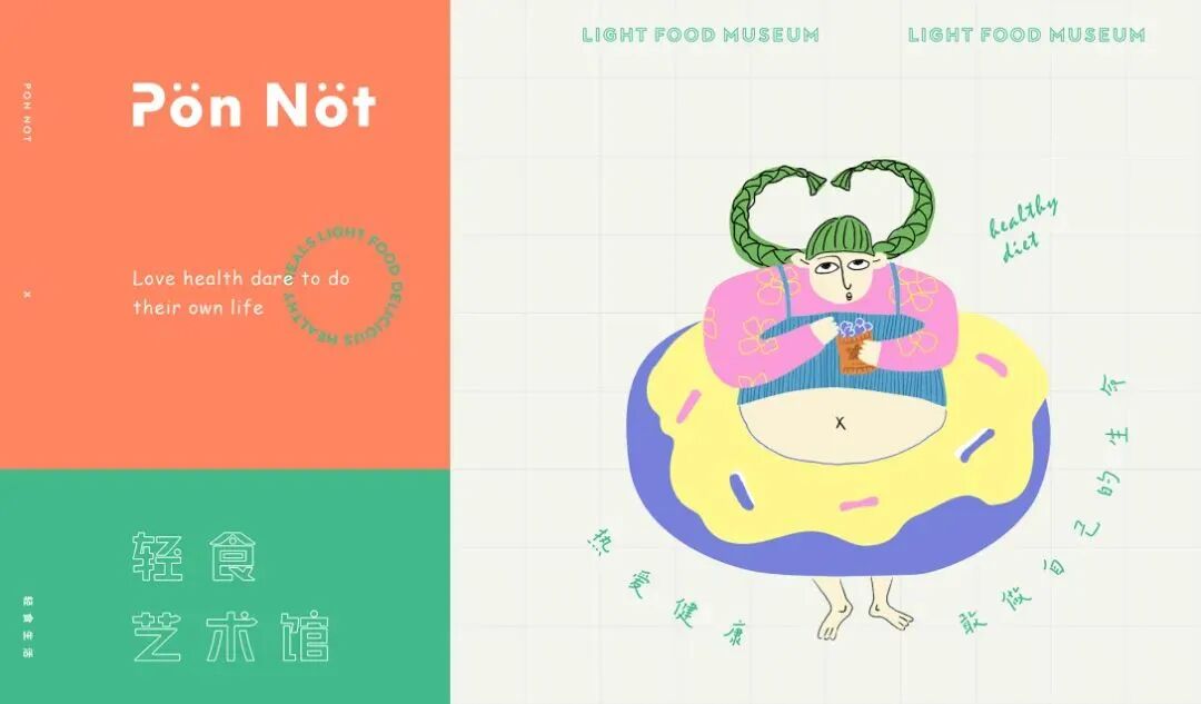 轻食艺术馆的品牌VI及包装设计,用斑斓的色调搭配趣味画风,巧妙地将健康饮食与生活美学结合起来,打造新式的艺术餐饮,提醒你在养生的同时,也别忘了精致。