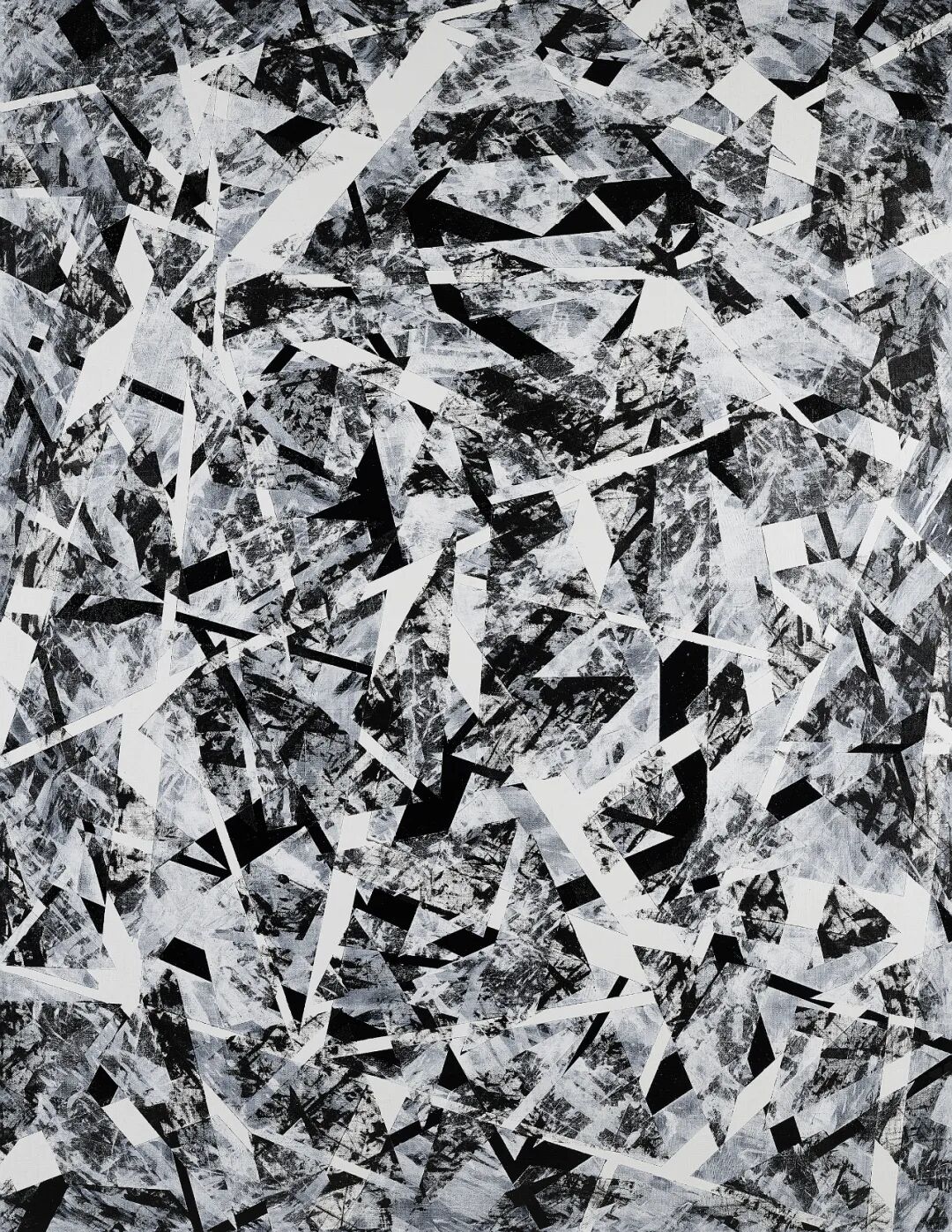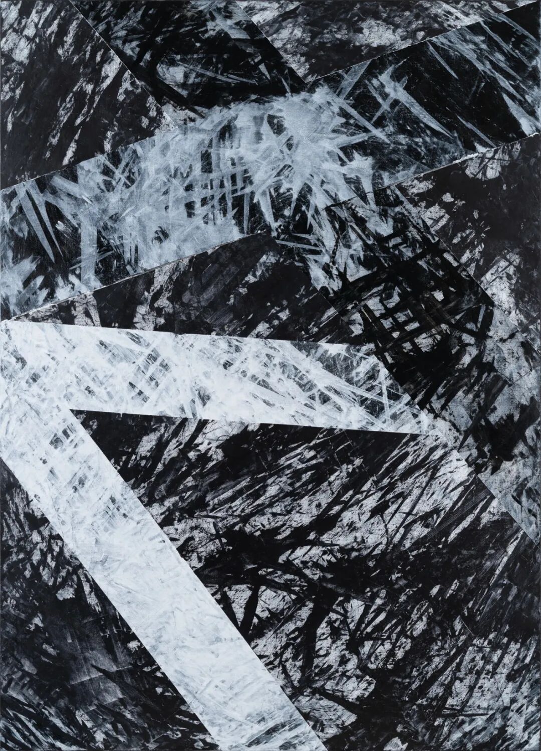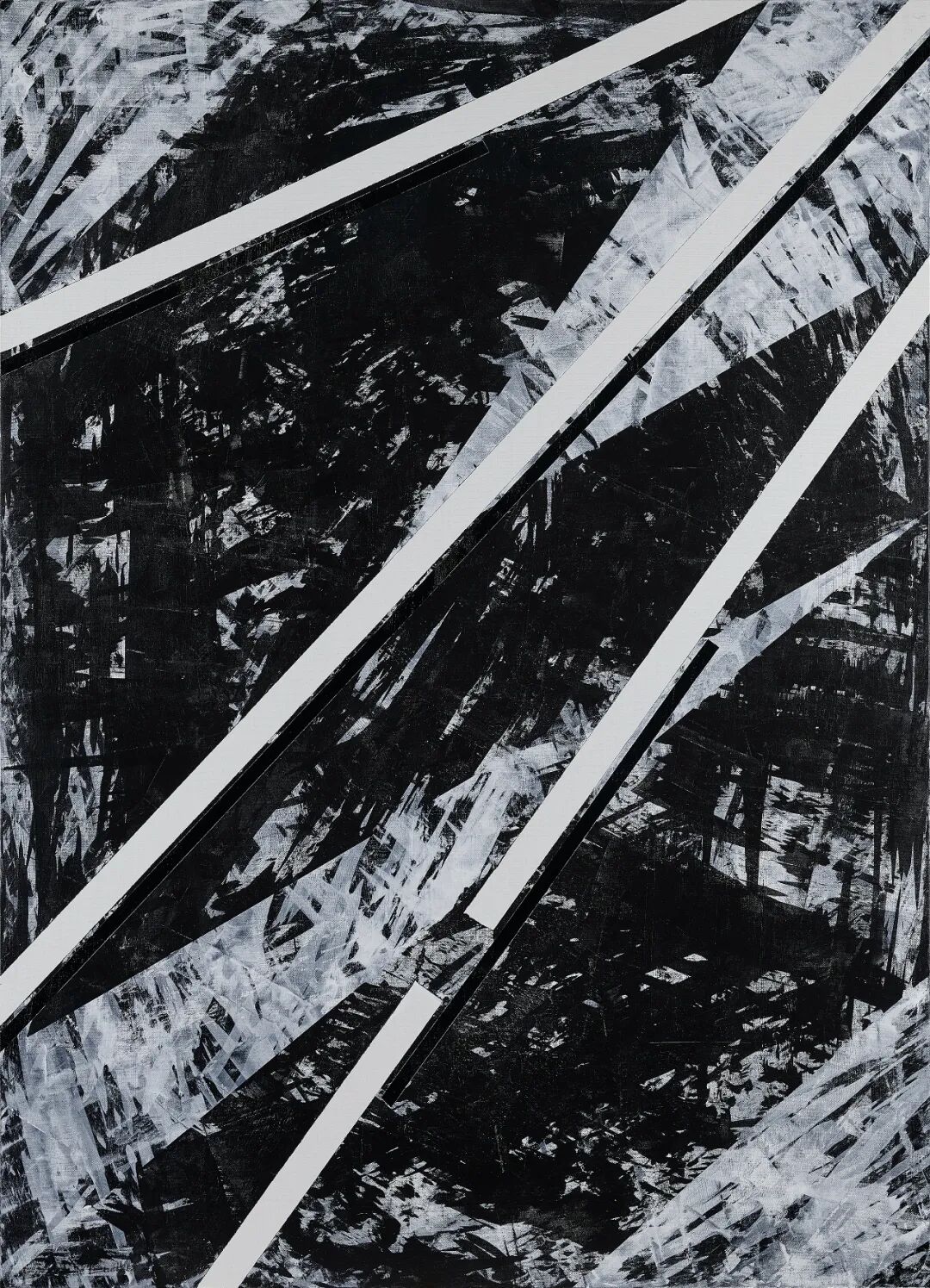 吴谦:最近这3、4年的创作构成了墨系列的第三阶段,我这次参展的几件都是属于第三阶段的作品。我是在第二阶段行动绘画的基础上,结合了几何抽象的概念,用规则或是不规则的色块线条在画面上进行分割。我在近期的绘画中融入了纯黑跟纯白的色块和线条。我的绘画当中的一个主题脉络,就是我始终在用黑白这两种颜色去表达和描绘我所理解的世界上很多对立而又统一的二元,比如:东西、古今、善恶和阴阳等等。其实在我们的生活中,在这个世界上,我们每天都在面对着很多这样一种对立而又统一的二元。但绝对的黑白是不存在的,绝对的善恶也是很少的,所以有大量的黑与白之间的灰色地带。那么这个当中的色彩关系就千变万化,从纯黑到深灰到中灰到浅灰到纯白。虽然我是用黑白两种颜色在进行创作,但其实它这里面有无限的可能和空间。