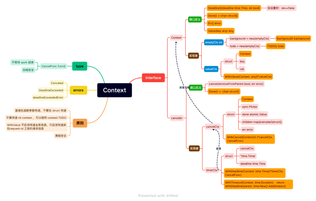 而timerCtx是嵌套的cancelCtx,同样他也可以同时调用Context接口所有 method与cancelCtx所有method ,并且还可以重写部分方法。而 valueCtx和上面两个比较独立,所以直接嵌套的Context。