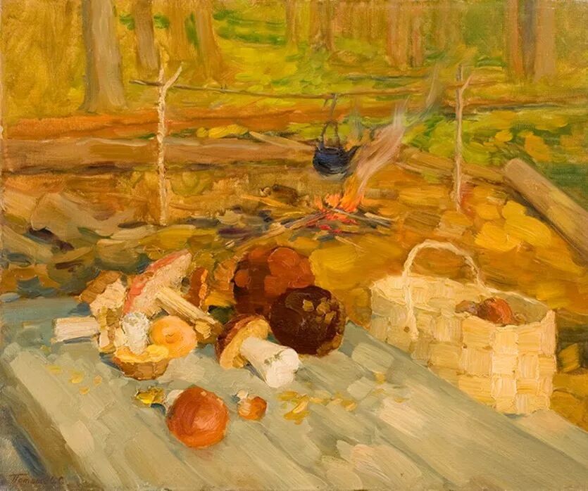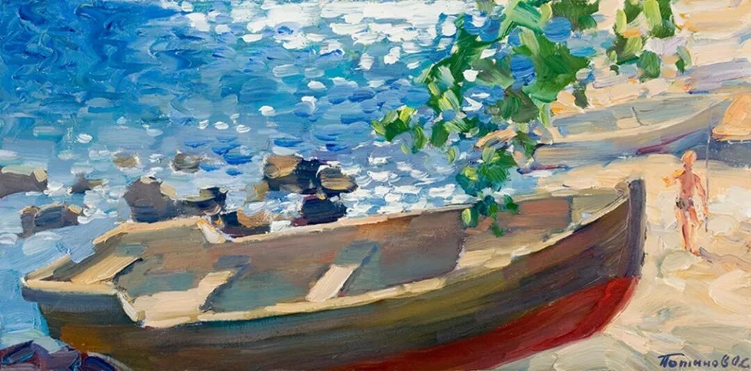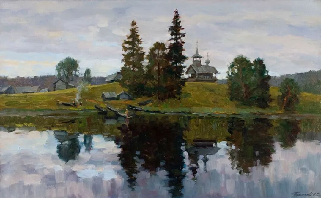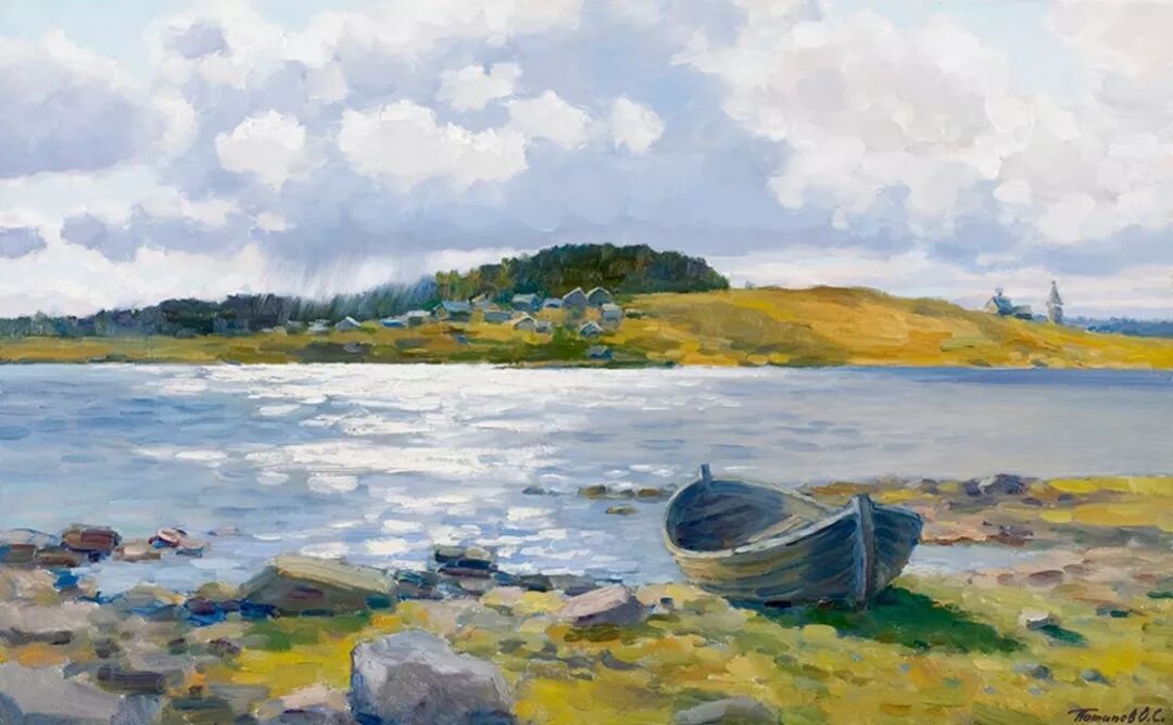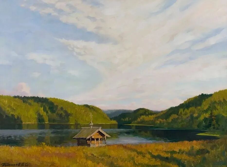 波塔波夫延续着俄罗斯传统写实风格绘画,有着人与自然环境的和谐。从他安静的作品中,我们可以看到他坚持对自然感知的创作信念。在他的风景中,我们很少看到人的出现。我们可以看到拥有浓郁俄罗斯房屋的村庄,深林中的教堂,更常见的是在湖边或小船。
