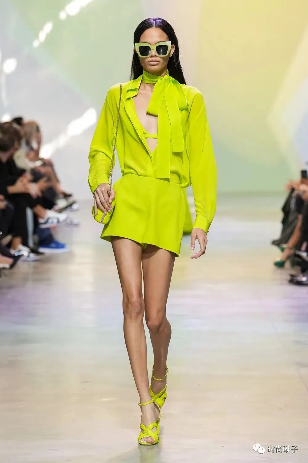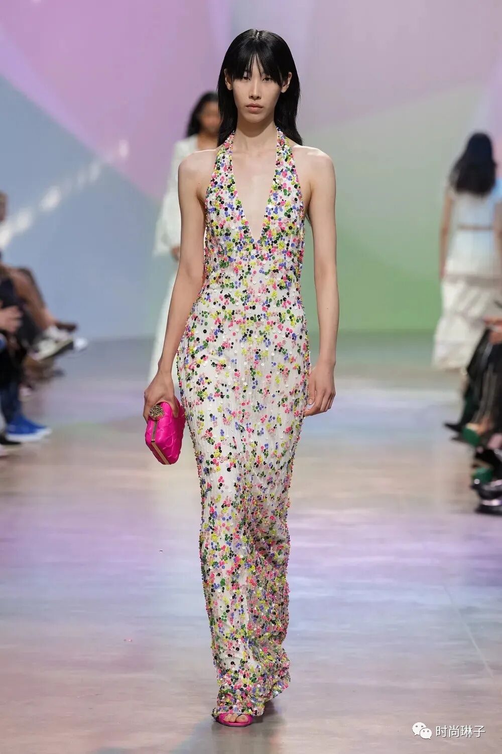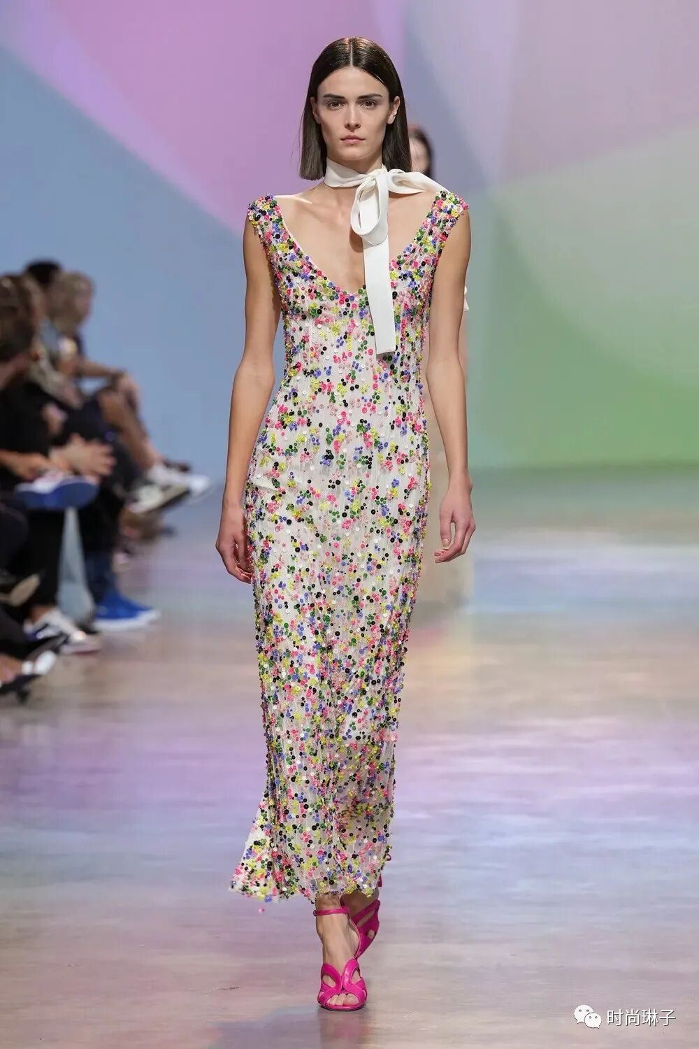 从日装到晚装,从干净的白色渐变到光彩照人的桃红色,绿色,紫罗兰色…… 缤纷的色彩带给整个系列更多的可能性。