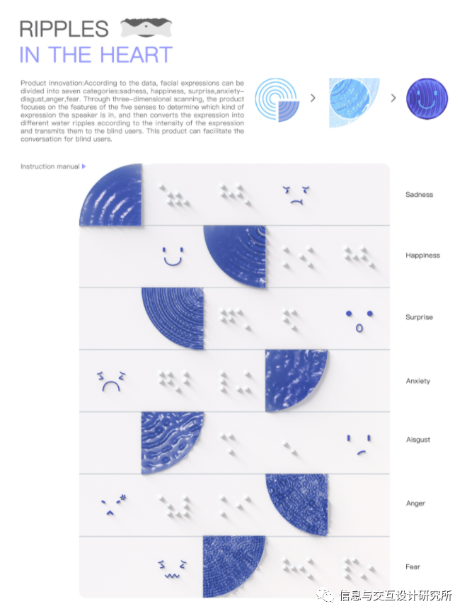RIPPLES IN THE HEART是一款专为视障人士设计的表情识别仪,能够分辨七种基本情绪,通过水波纹的变化能够让视障人士轻松理解所表达的情绪含义,减缓交流时心理压力,提高他们的生活自信。