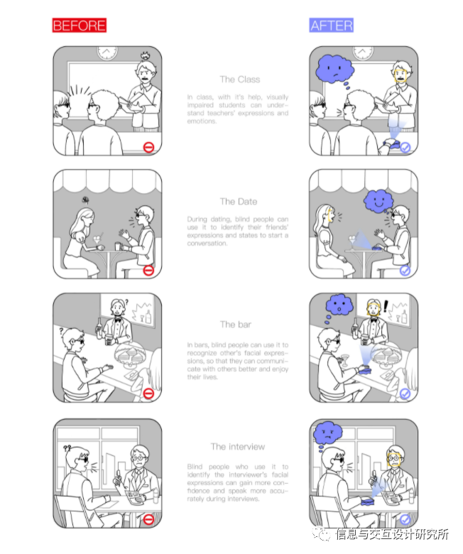 在课堂上,视障学生使用RIPPLES IN THE HEART,可以理解老师的表情和情绪;在聚会期间,视障人士可以通过此产品识别朋友的面部表情和状态,以便更好地与他人交流;在面试时,视障人士使用此产品,能在面试中获得更大的自信。