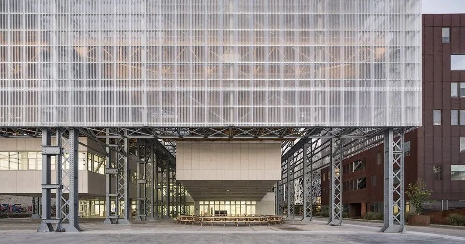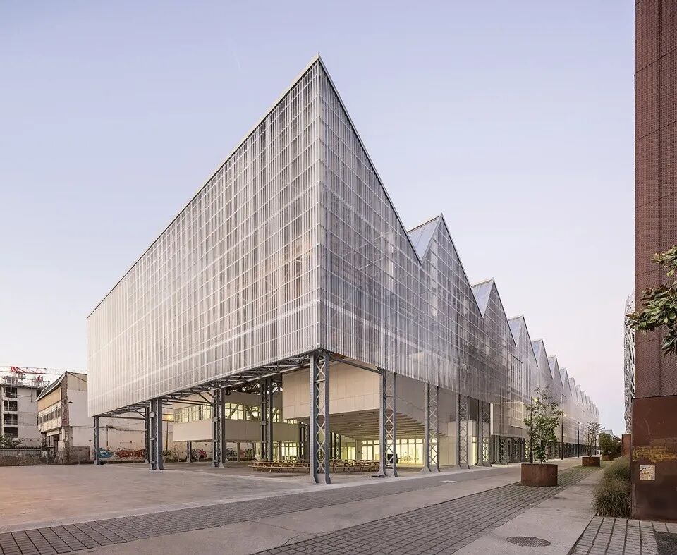 新建筑立面,半透明材料覆盖在原本的工业建筑结构上,给人以轻盈的感觉