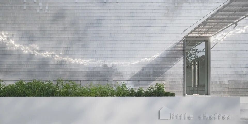 建筑下部,聚碳酸酯版被切割成与木瓦相同的尺寸,构建出一个半透明的立面,木瓦从上方“洒落”下来,逐渐与聚碳酸酯表面融为一体。