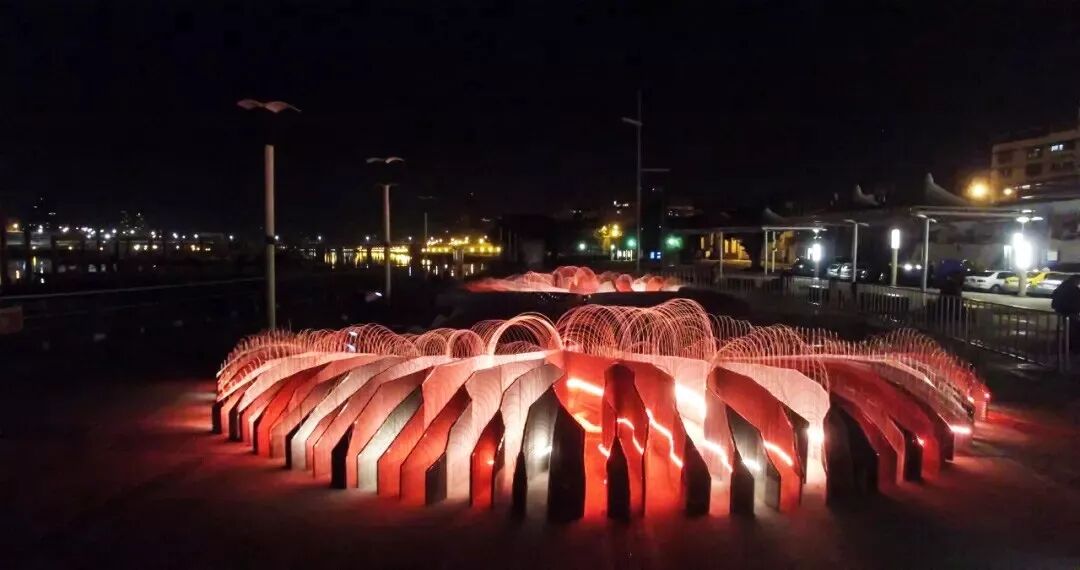 平静的水面被跳跳泉打出一圈圈涟漪,精准的调控使跳泉没有延迟。跳起的水珠,跟随的步伐,不亦乐乎。