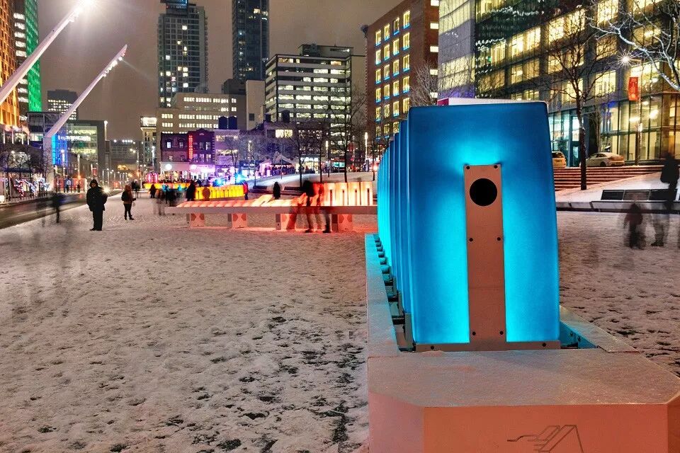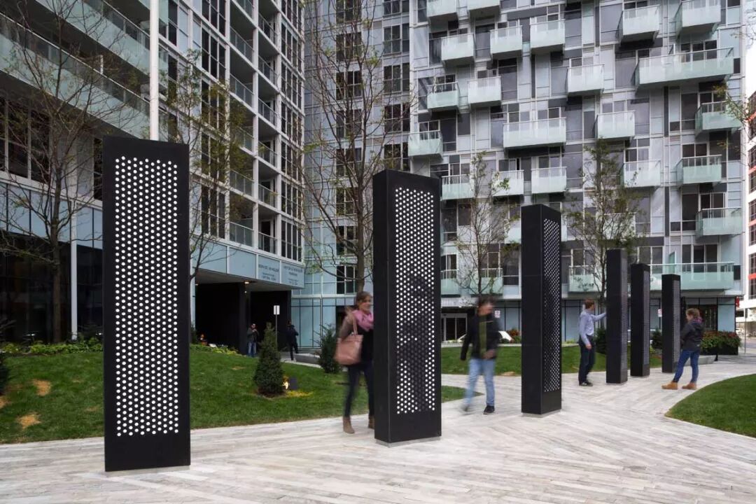 这个互动装置,被称为从后到前.它坐落在一条人行道上,斜穿过一个公园,一个49层高的公寓大厦在前面,在多伦多的娱乐区。