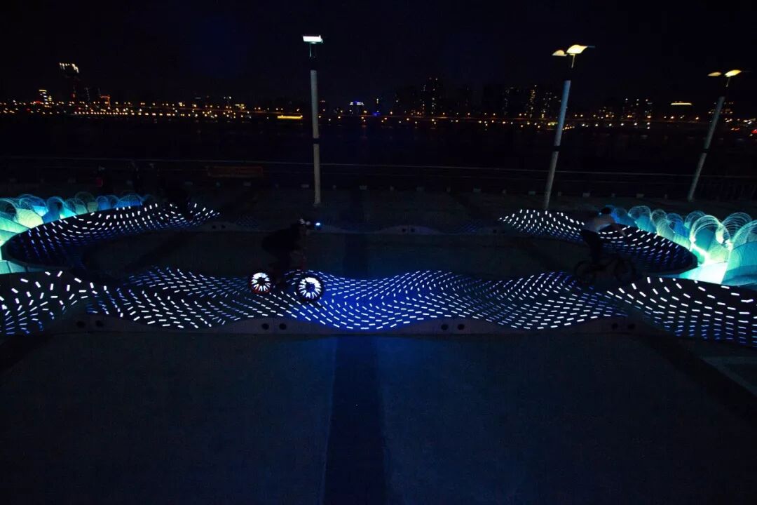 Vel02是2016年在台北推出的一款壮观的灯光装置,旨在宣扬运动和健康城市之间的联系。这件作品像一个被血脉包裹着的巨大细胞,又像是植物的茎秆往外延伸,让人们意识到积极的生活方式和好的空气质量对建设可持续发展的智慧城市的重要性。
