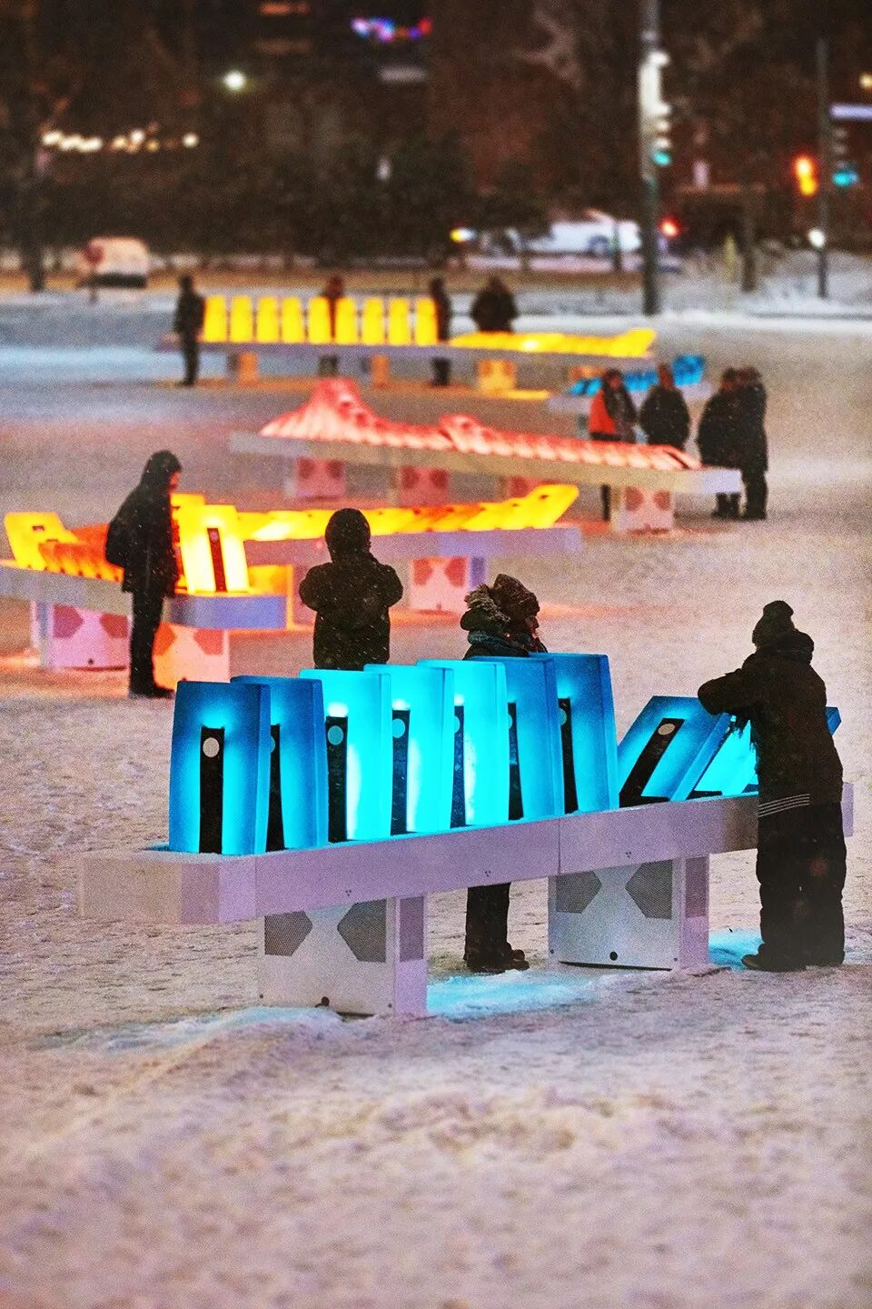 由Ingrid Ingrid设计的《多米诺效应》是第九届Luminothérapie冬季灯光展中的优胜作品。该装置由120个发光的“多米诺骨牌”组成,共分为10组,每组都拥有不同的声音和灯光效果。当人们把这一长串“牌”推倒时,它们将“奏响”一系列丰富多彩的音乐,包括打击乐、马林巴琴、巴拉芬、长笛和人声等。