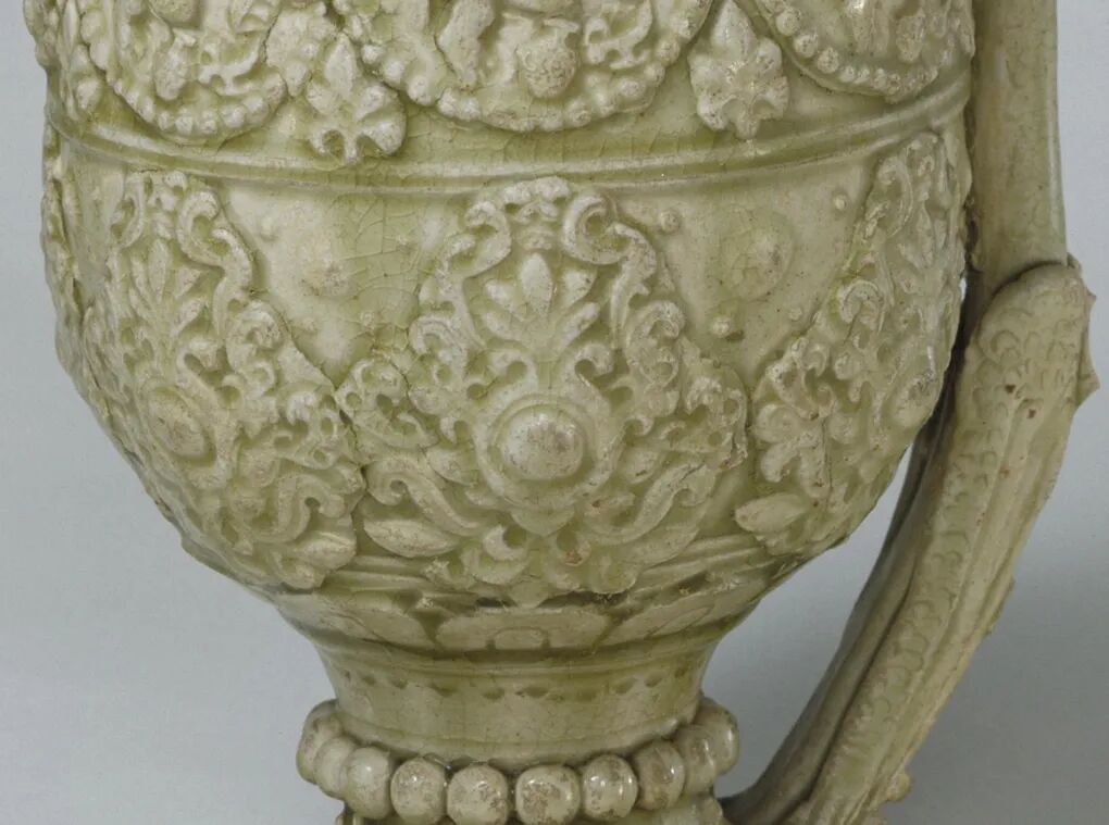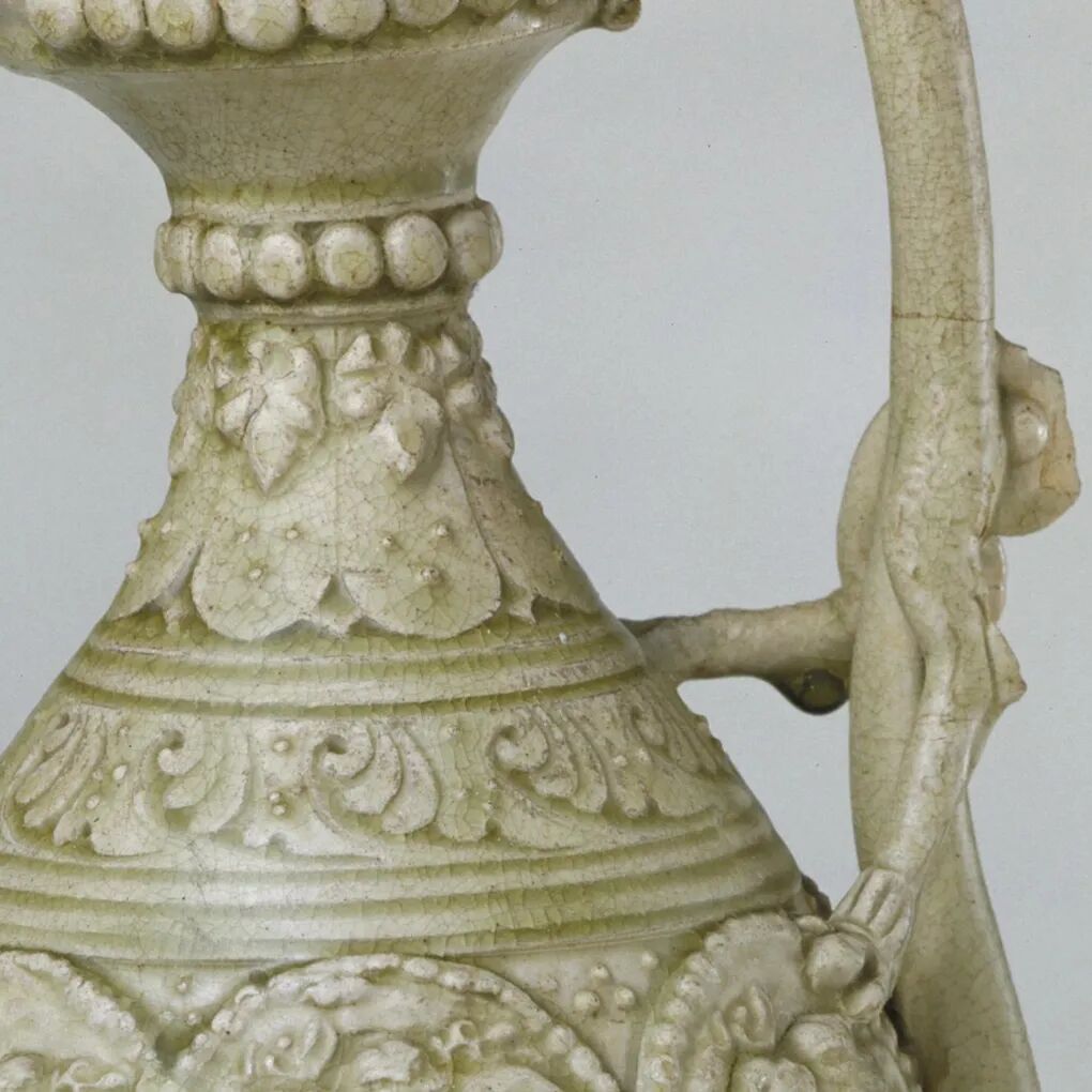 此壶胎体厚重,釉层凝厚,玻璃质感强,带有北朝以来北方青瓷的遗风。其装饰纹样繁复,结构严谨,层次清晰。