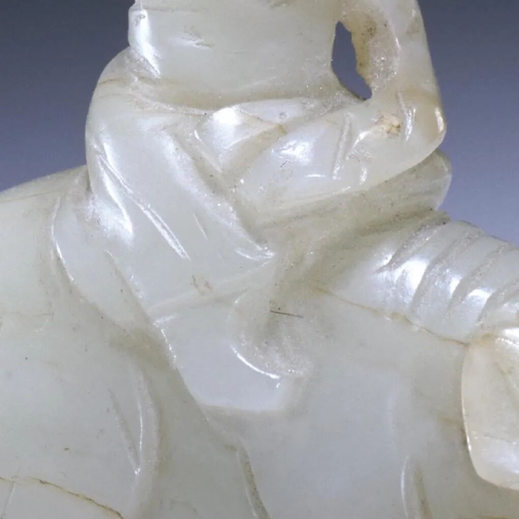 青玉有绺裂、絮斑。圆雕一男子侧身坐于象背之上。象卧伏,神态温顺。人物头戴软帽,微后仰。着长袖衫。右腿搭于左腿之上,右手举起放于脑后,左手置于腿上,长袖下垂,作舞蹈之姿。