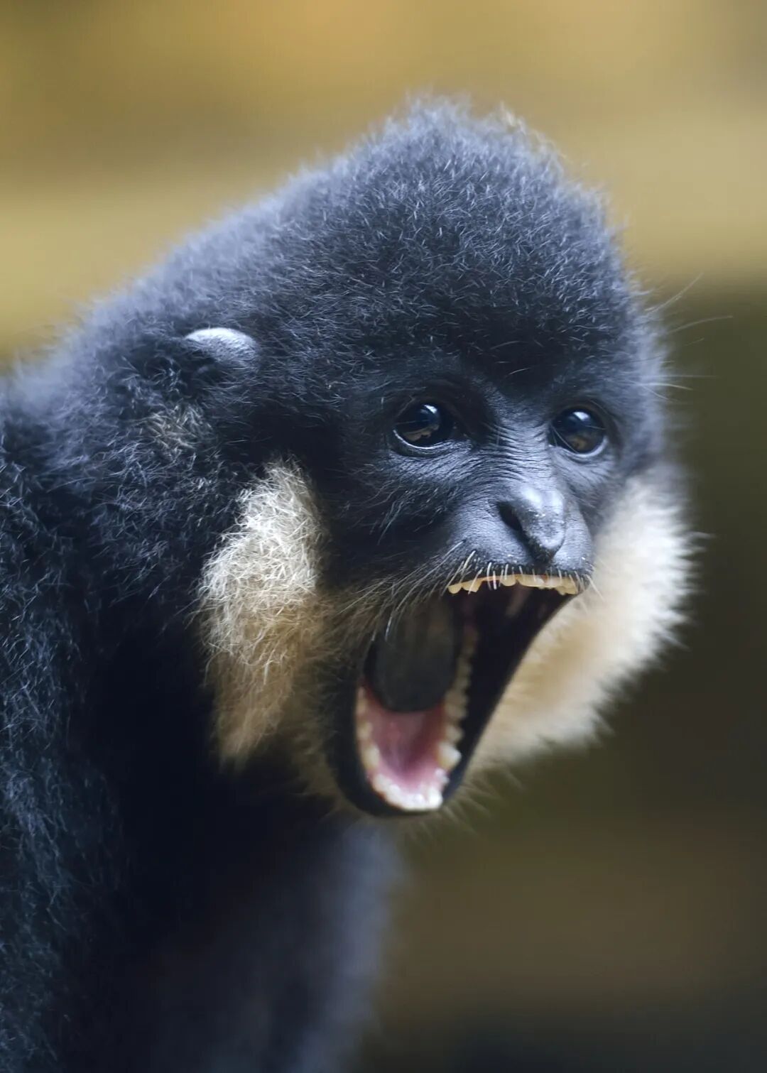实际上,长臂猿的特征非常突出,它们不仅智商极高,较其他现存的灵长类动物更接近人类,而且手臂极长、喉部有音囊,特别擅长鸣叫,“两岸猿声啼不住”说的就是它们。