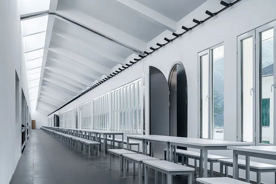 和前人一样,建筑师因地制宜,利用马厩既有的长度,设计了长达133米的百米食堂,在薄暮时分,远看这栋透着暖光的建筑,就像诸葛亮布下的一字长蛇阵,和星汉遥相呼应。
