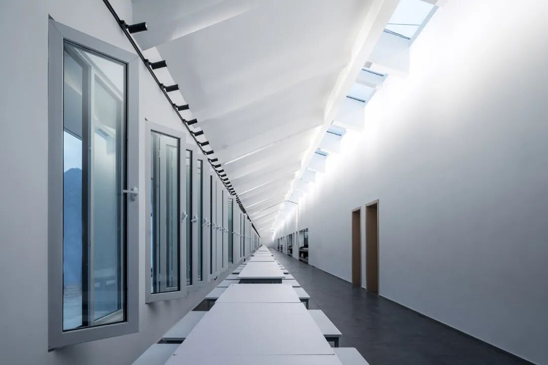 屋脊靠近建筑中部的一侧,开设百米天窗,引来明亮的自然光线,有阳光,也有月光。孩子们置身其中,就像趴在家中的阁楼一样,可以仰望星空。每当夜幕降临,食堂灯火通明,温暖的光线透过天窗向山峦和天空弥漫,让整个小镇充满家的温馨。