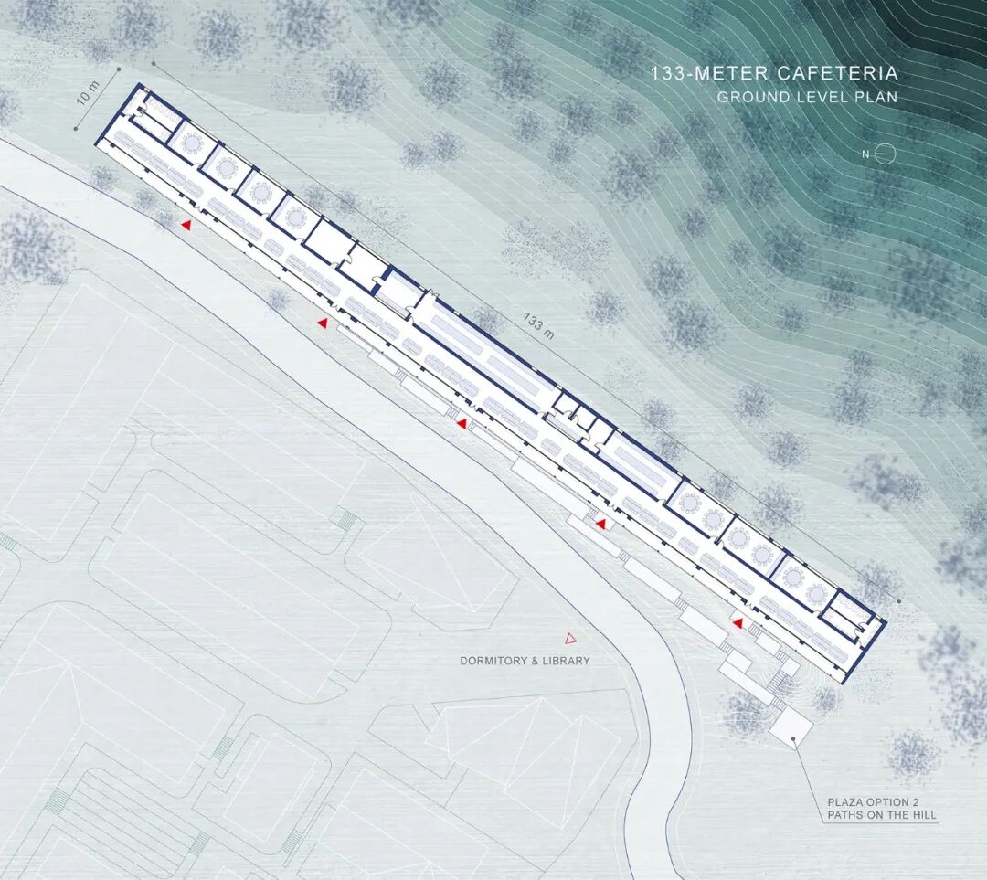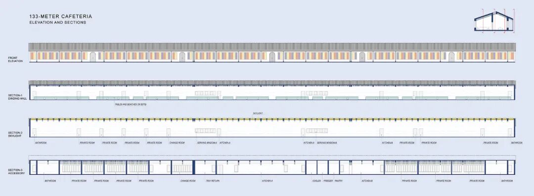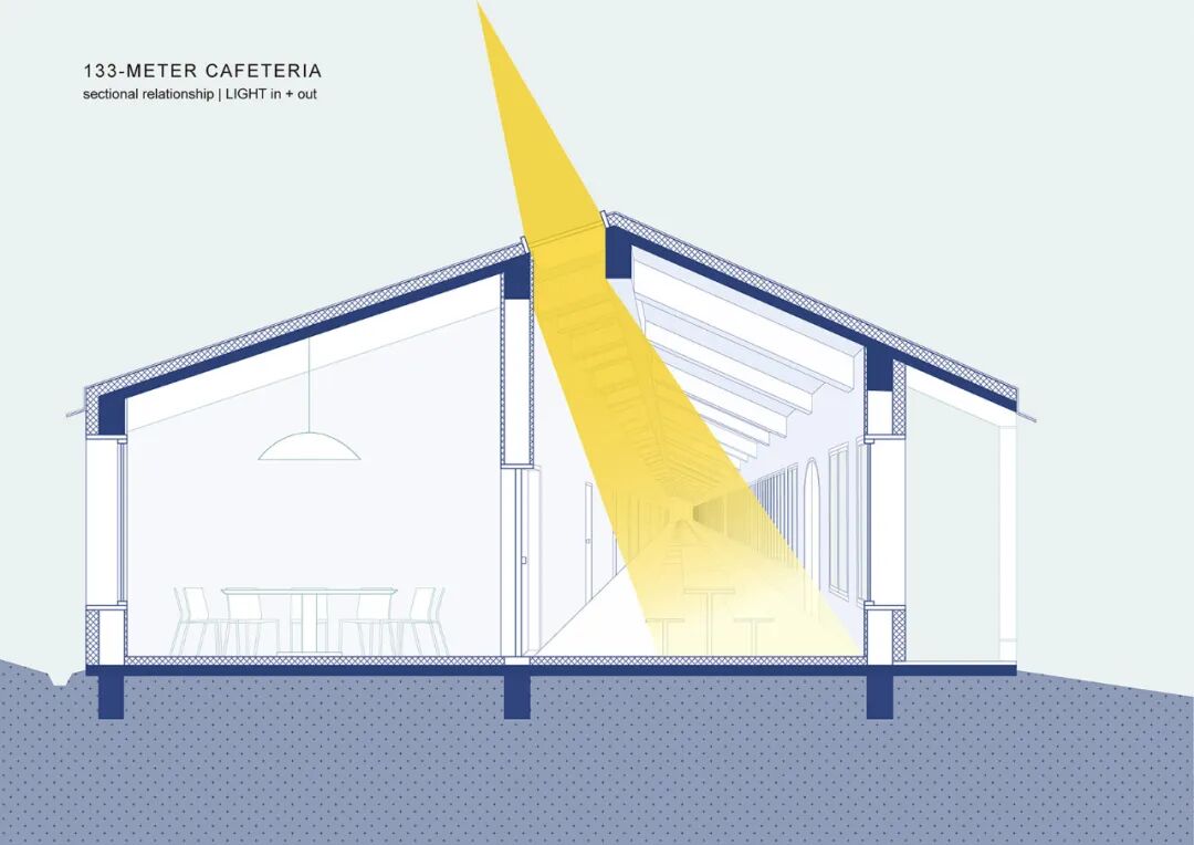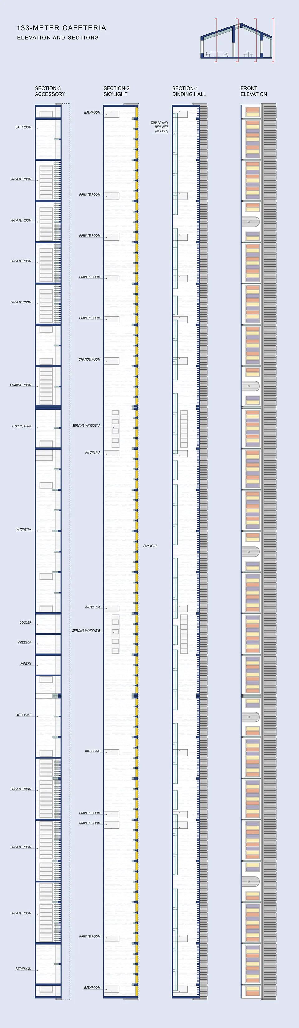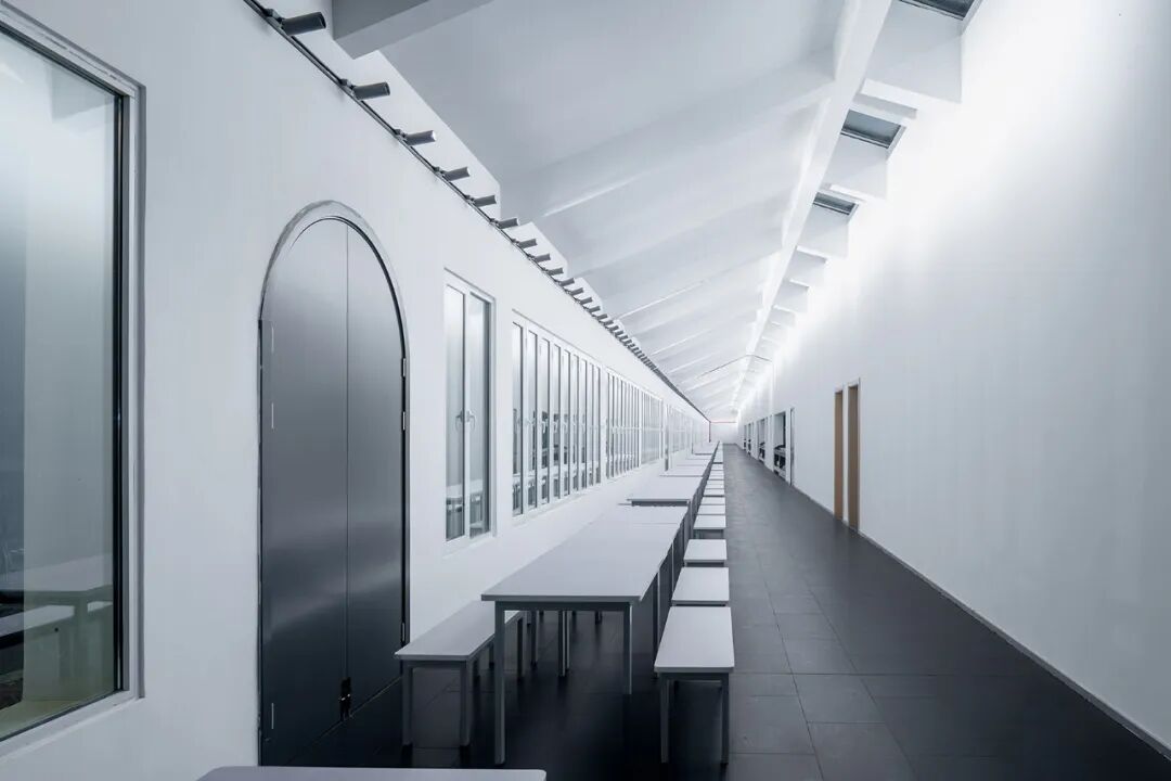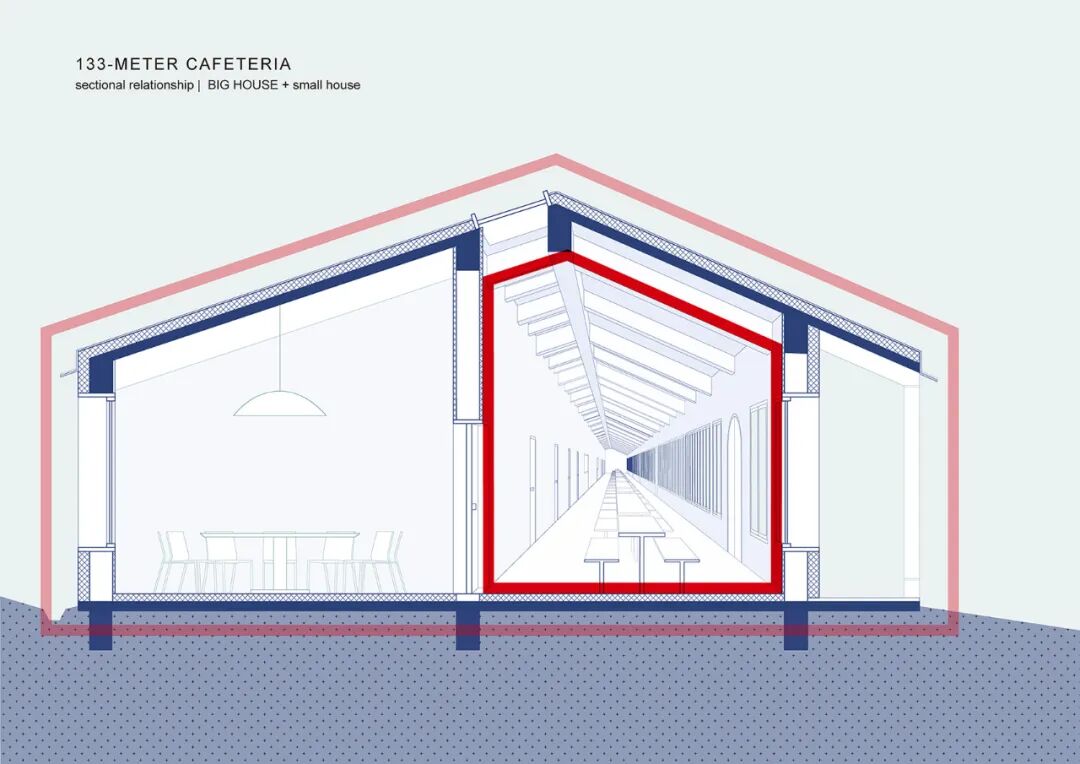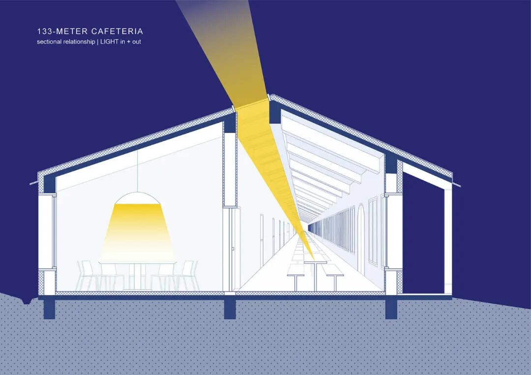 一个食堂怎样在学生汇聚时有条不紊?建筑师把长长的食堂均分,开了五扇大门,用以疏导人流。而房子的10米进深,则被分割成前后两部分。前面是就餐区,可拼成百米长桌,也可以分区使用,它被定义为百米空间。