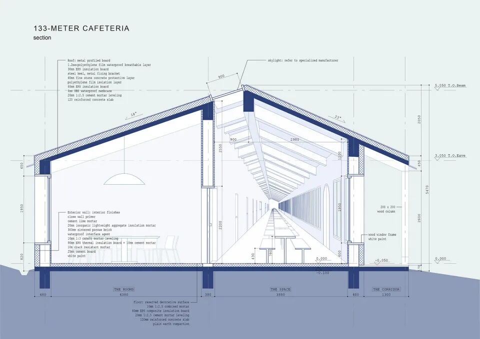 食堂总给人一种过客的印象。百米食堂试图改变人们的认知:食堂也可以像家一样,从容、自然、亲密和愉悦。建筑师们借助简朴的建筑语言,在食堂里融合街和家带来的美好体验。
