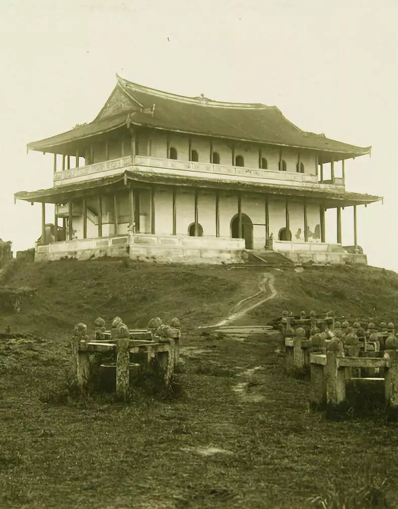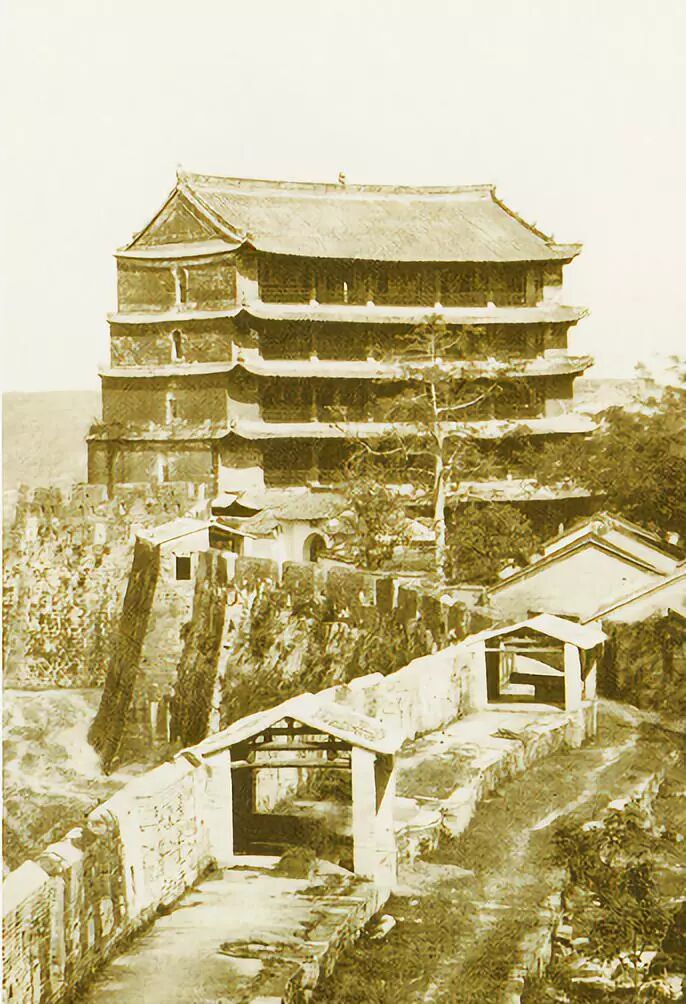 江南三大镇海楼之一,为福州标志性建筑,始建于明洪武四年(1371年),历史上13毁13建,图中建筑为清光绪十八年(1892年)所重建,1933年又毁于大火。1948年重建后的镇海楼又于1970年以易被作为军事目标攻击为由炸毁拆除。现镇海楼为2006年后所重建。