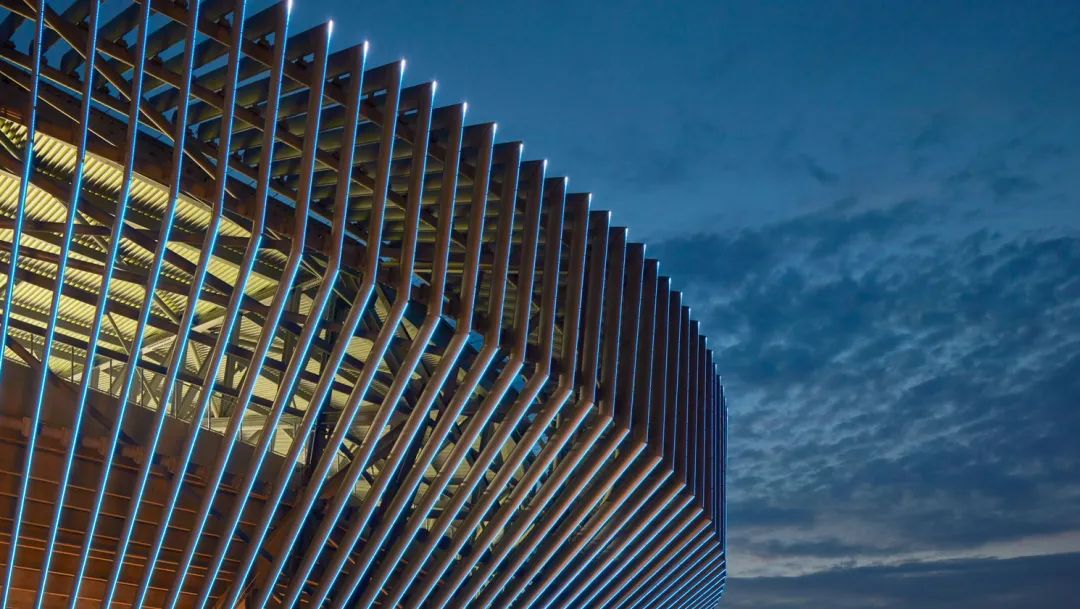 建筑立面具有三角形开口,在视觉上通过斜交网格强调了碗的结构,形成了一个穿孔的屏障,为内部大厅提供了阴凉和过滤后的斑驳光线。高性能的立面和创新屋顶设计能够降低体育场的能源消耗,室外冷却技术可最大限度地提高露天体育场内的舒适度。