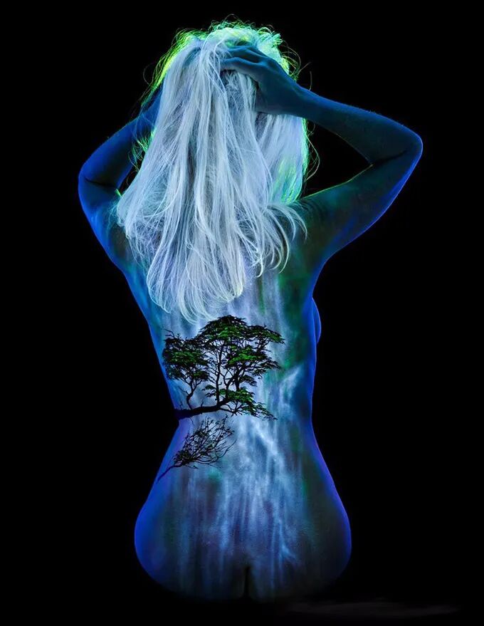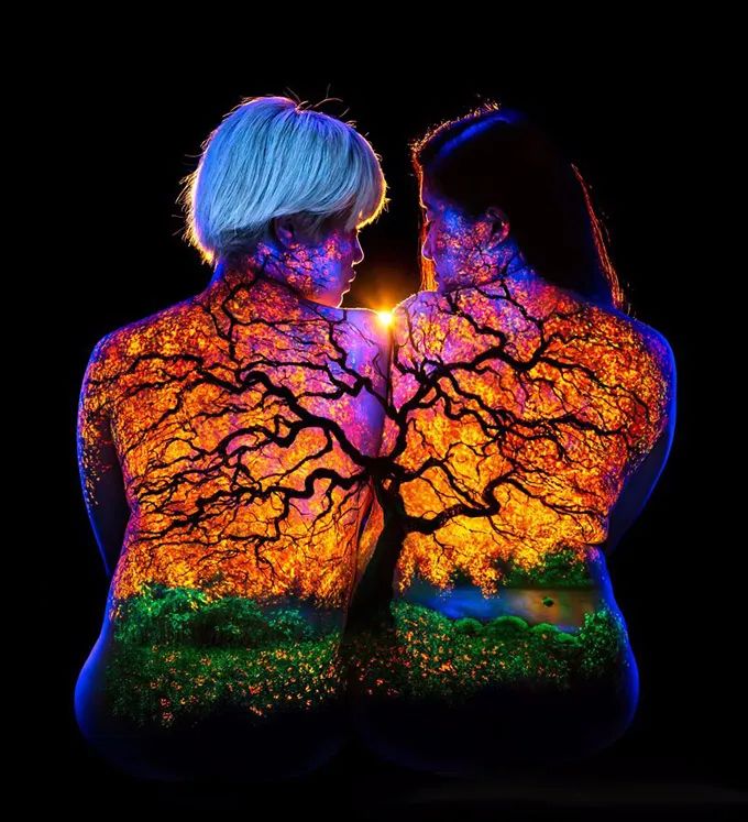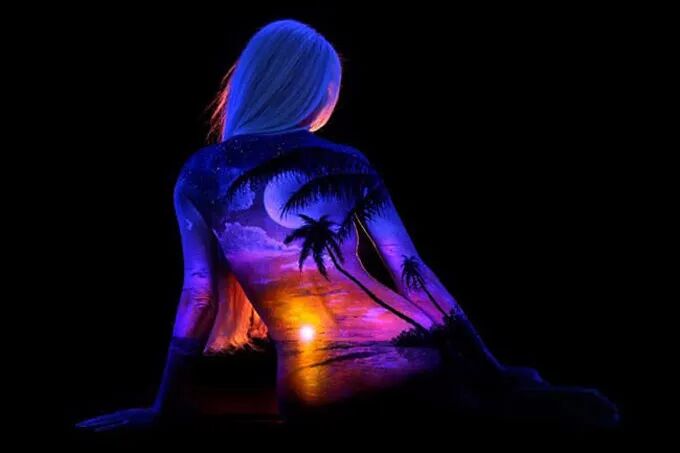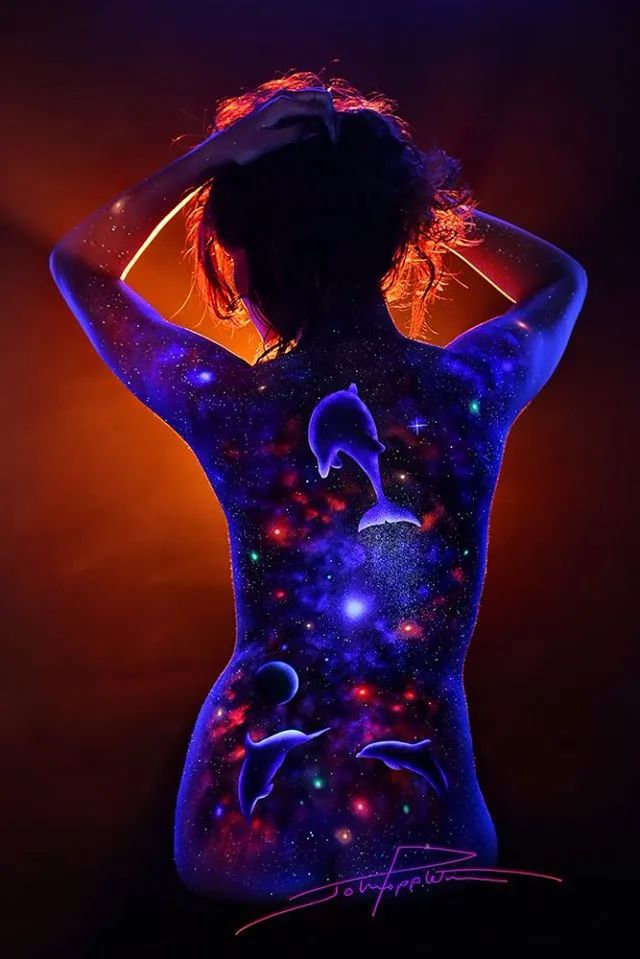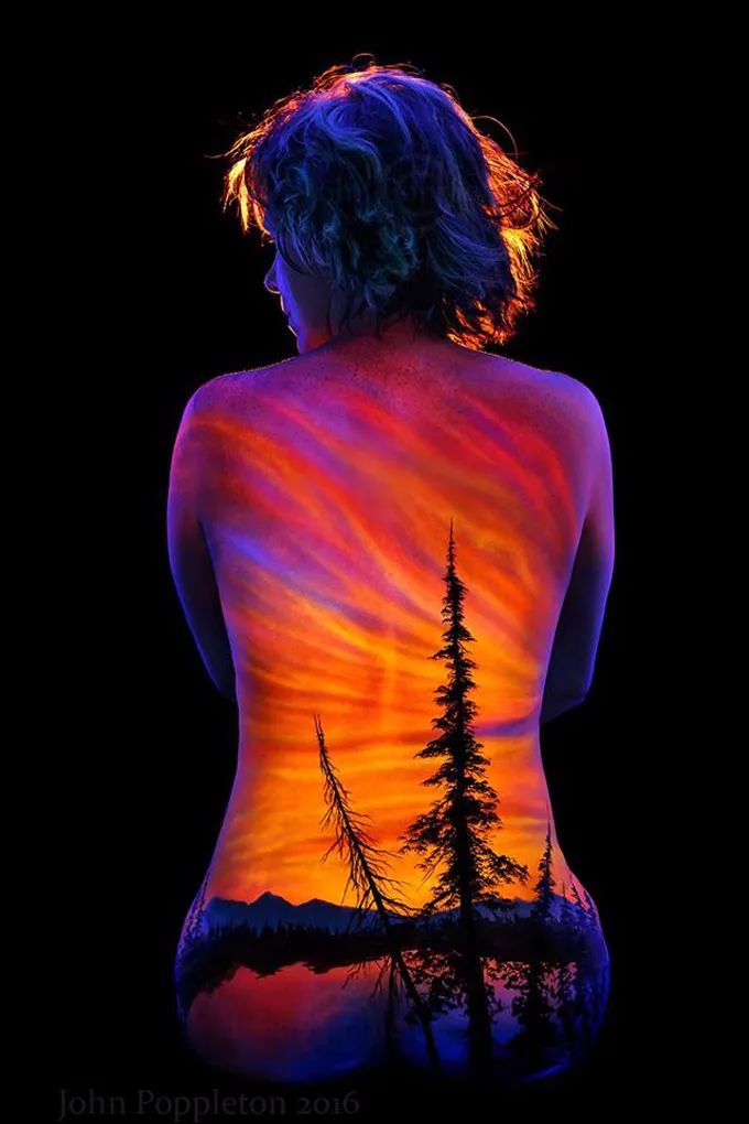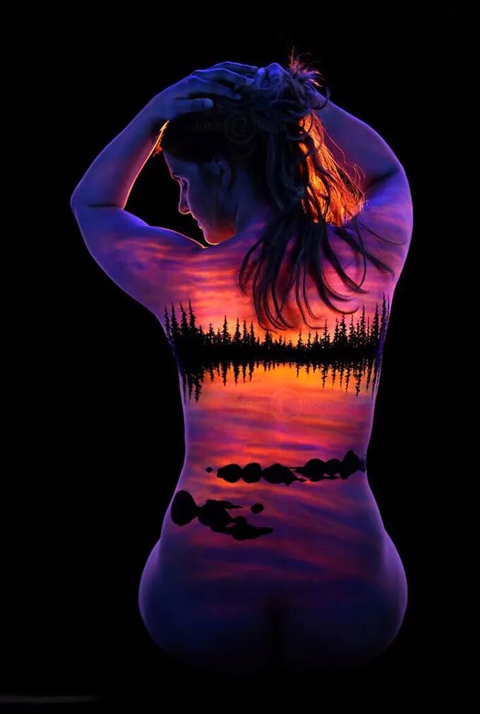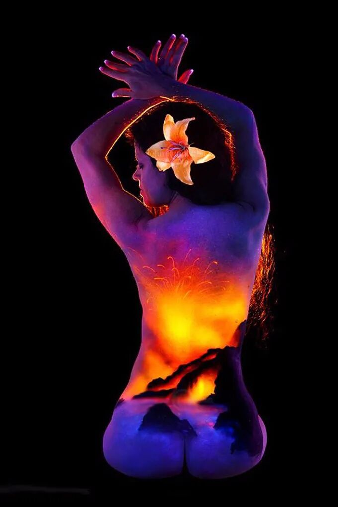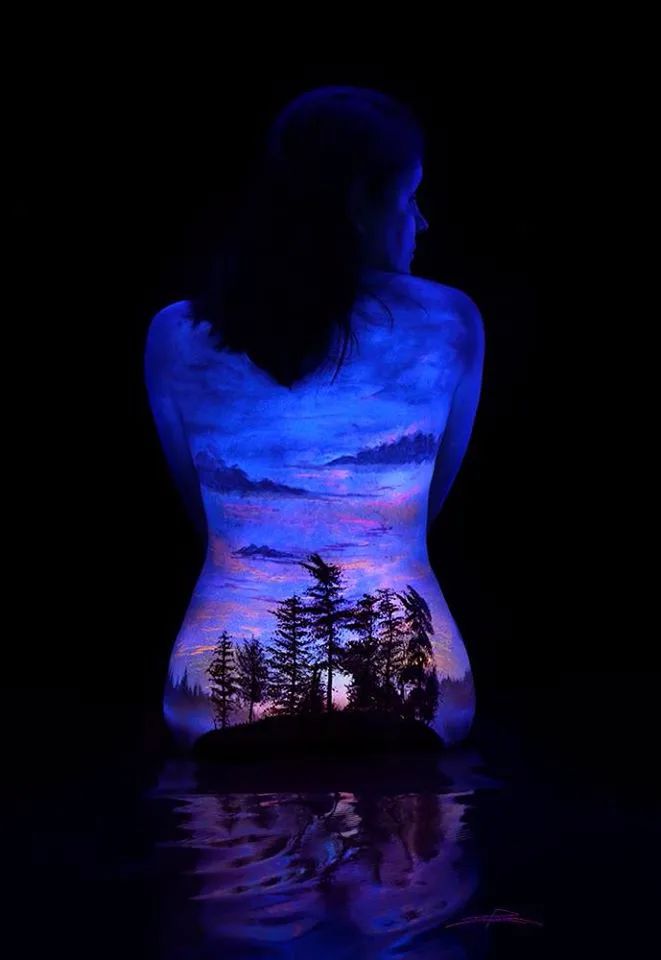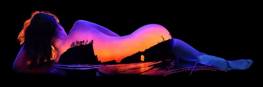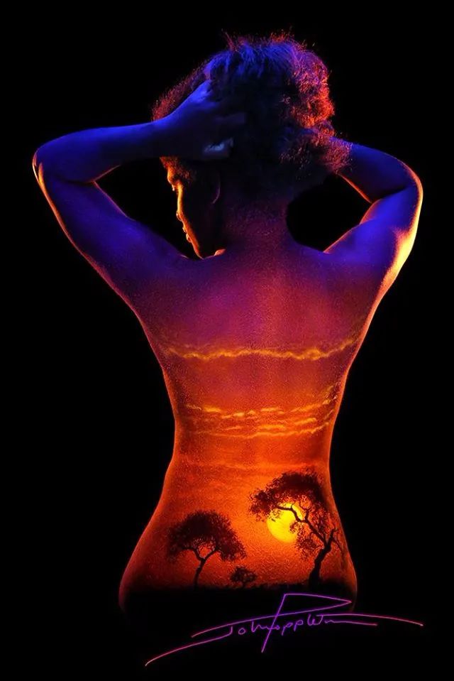 艺术家约翰利用黑色背景将女性的形体之美与大自然景象相融合,他把日落、热带海洋和月光照射下的山脉等自然美景涂画在裸体女性模特身上,并以惊人的紫外线照片的形式再现女性形体之美和原创艺术之美。 —— 前言