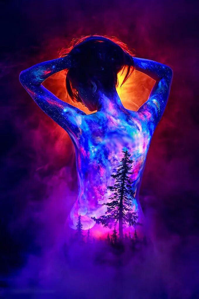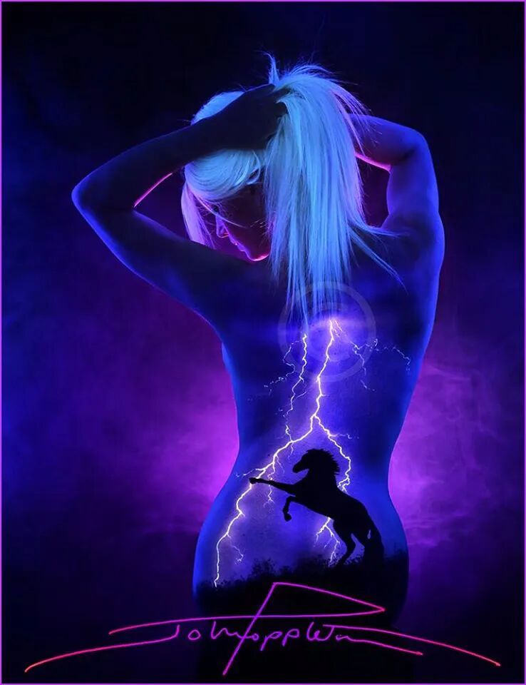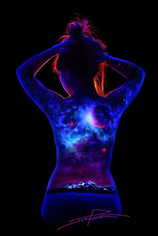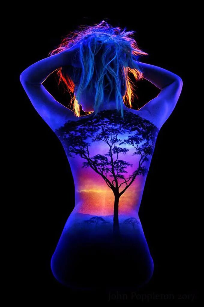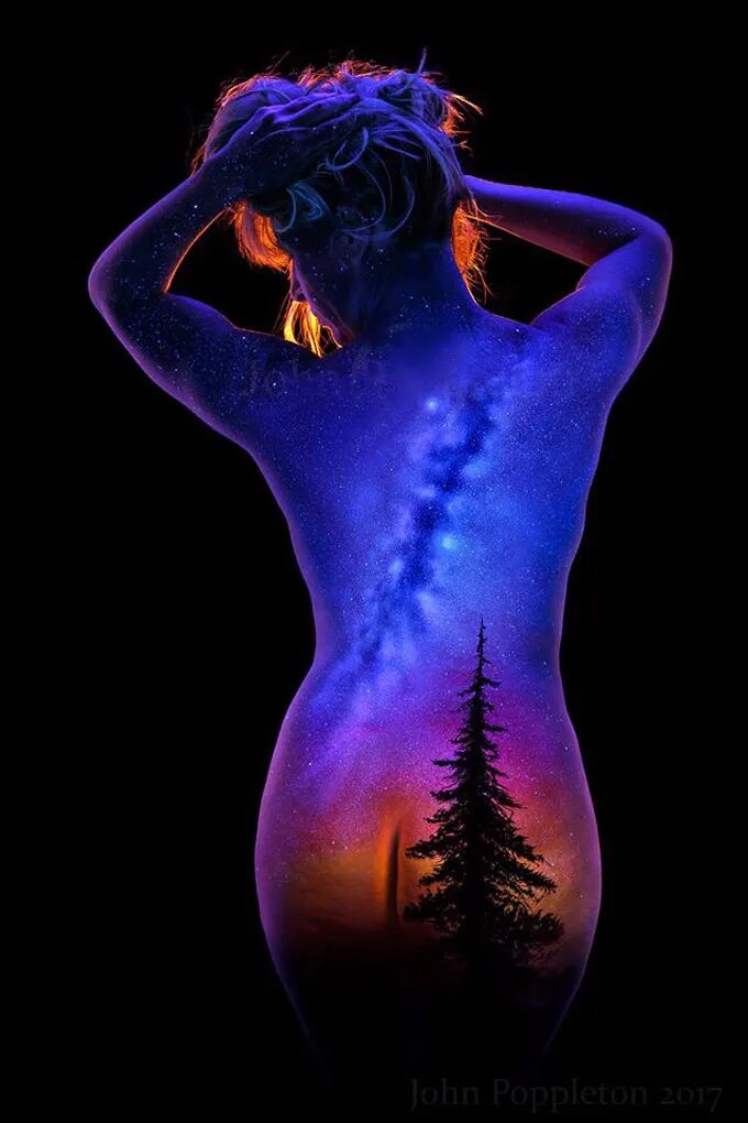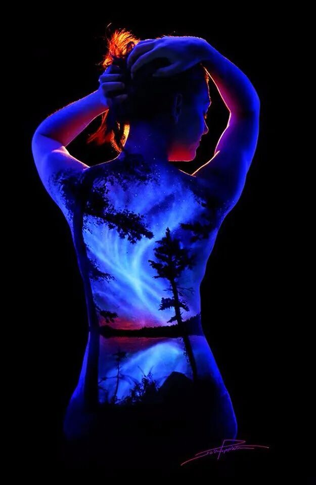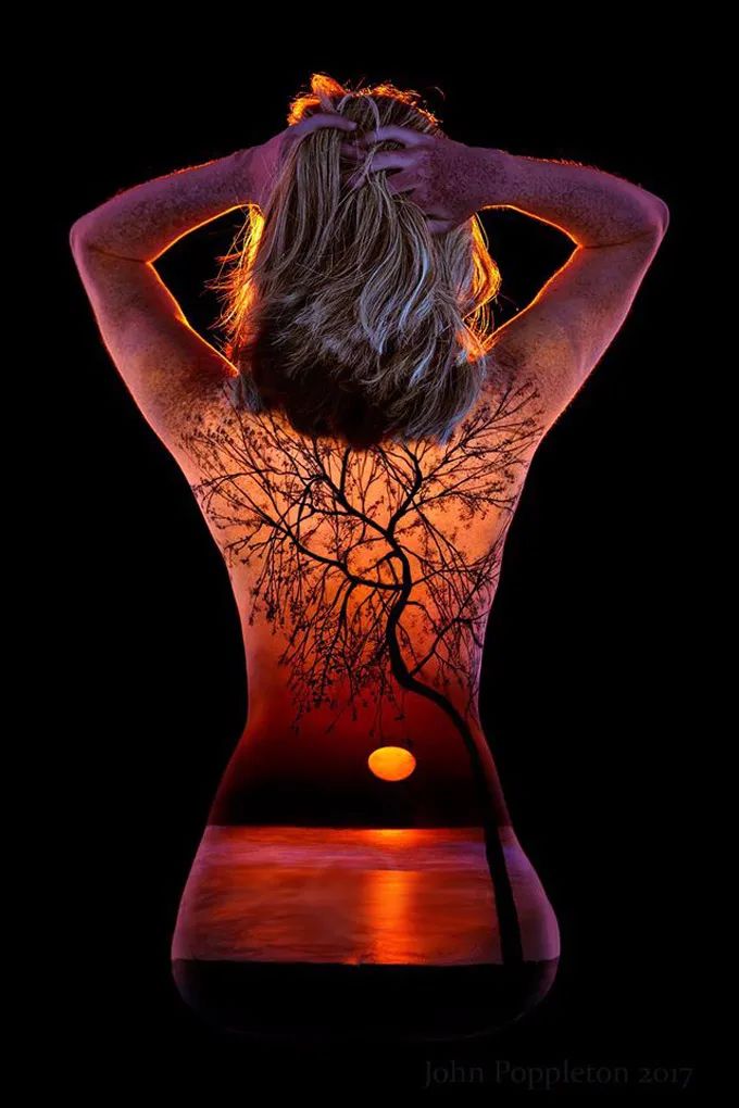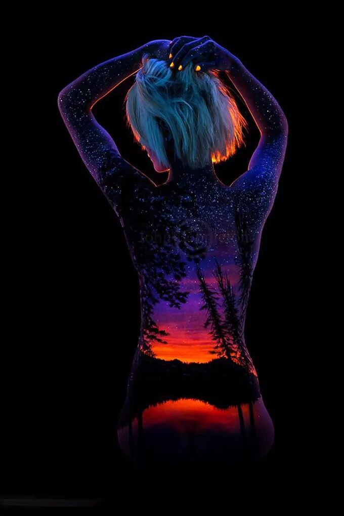 艺术家约翰利用黑色背景将女性的形体之美与大自然景象相融合,他把日落、热带海洋和月光照射下的山脉等自然美景涂画在裸体女性模特身上,并以惊人的紫外线照片的形式再现女性形体之美和原创艺术之美。 —— 前言