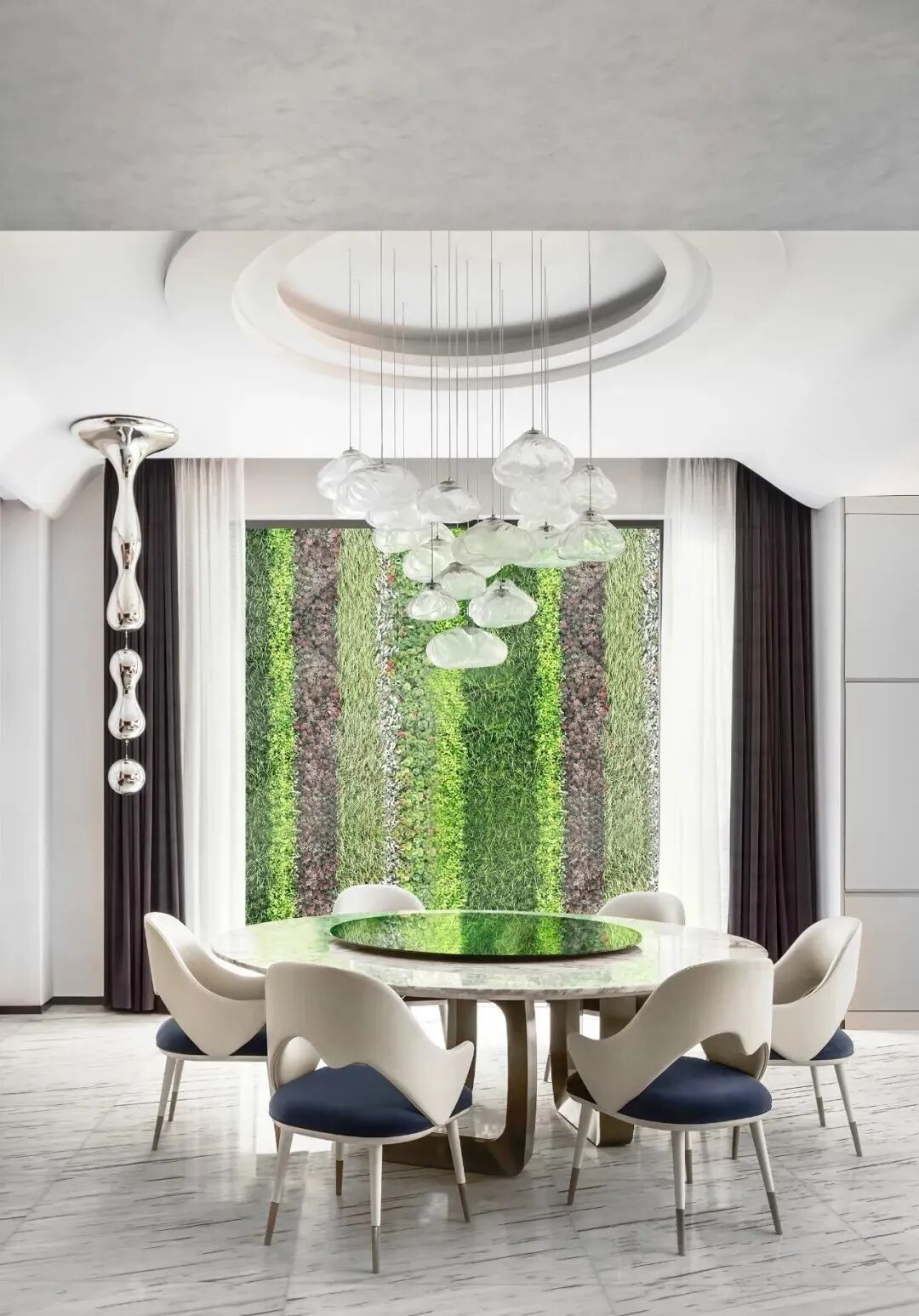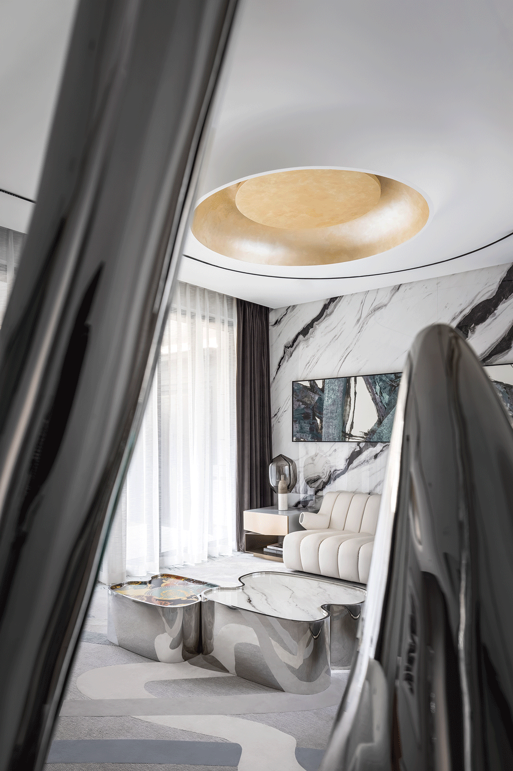 圆形的巴洛克式天花向下凸起,形如雕塑,实现了空间局部的艺术化。我特别选用Versace熊猫白岩板作为客厅主墙,它的黑白纹理像一幅写意山水画,暗含时尚对东方的凝视。
