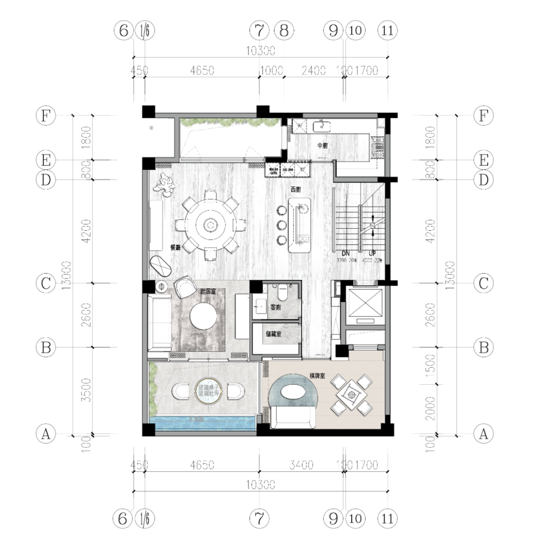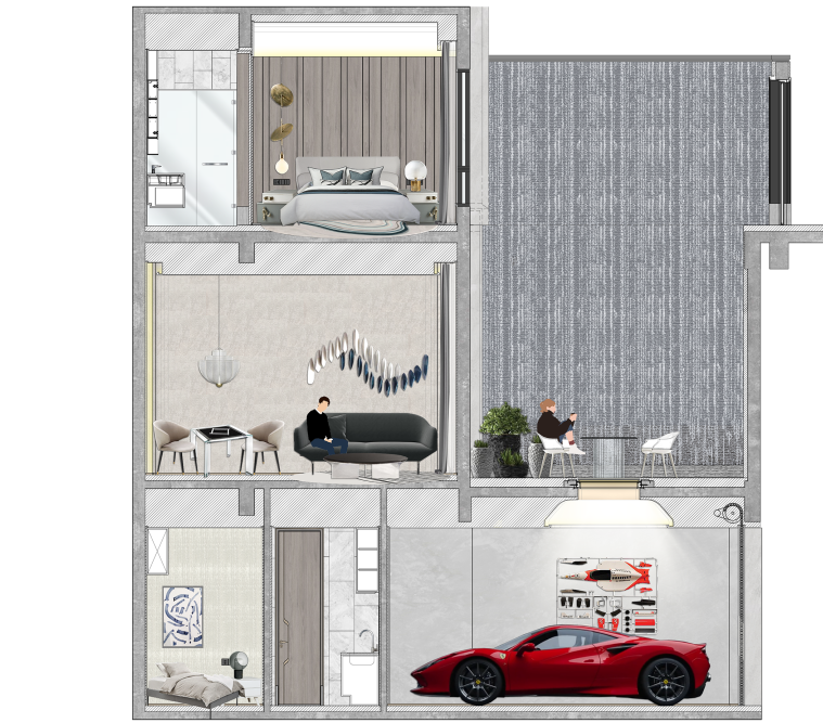 B2空间为书房综合体,作为「艺廊客厅」的补足,供主人会见更亲密的友人,入户车位则仅余一个。