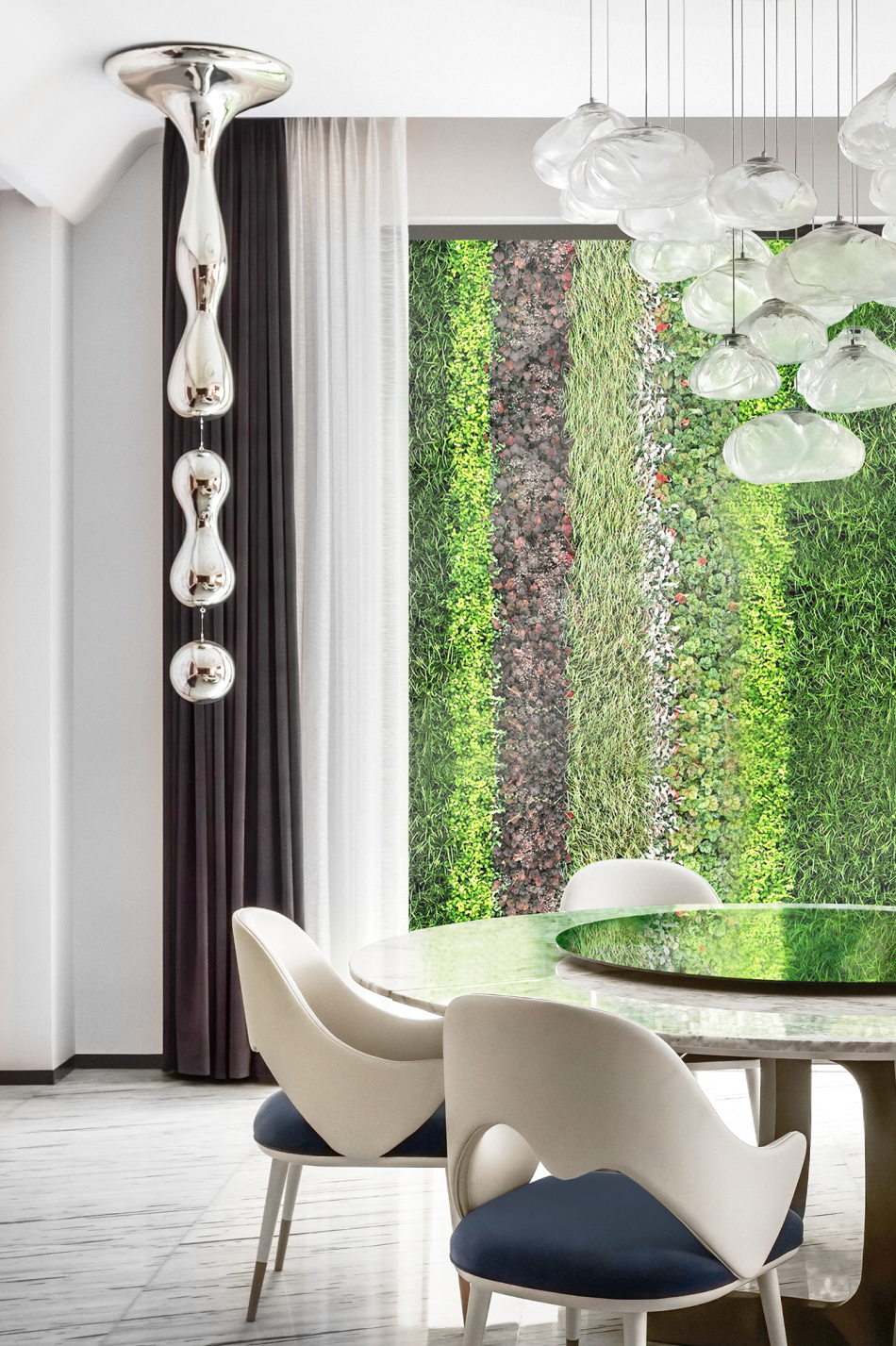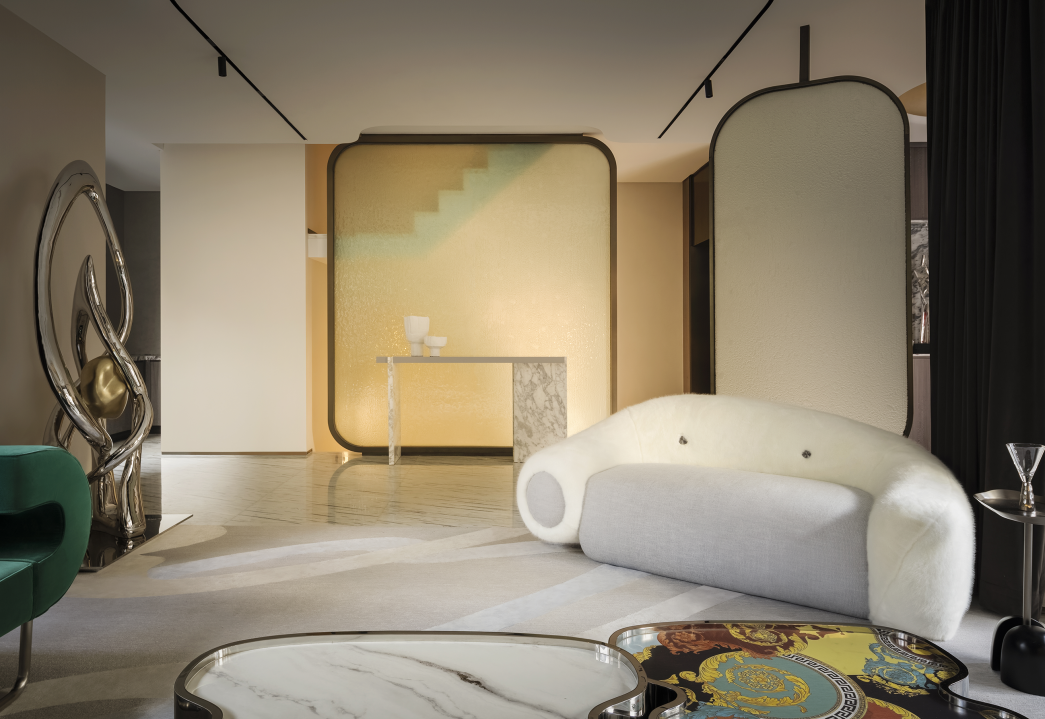 像设计时装一样设计空间,关注「版型」和「面料」。时尚品牌Versace的熊猫白岩板纹理如同东方的水墨画,成为客厅主墙……「美杜莎」凝望着这一切,散发出时尚致命的诱惑。