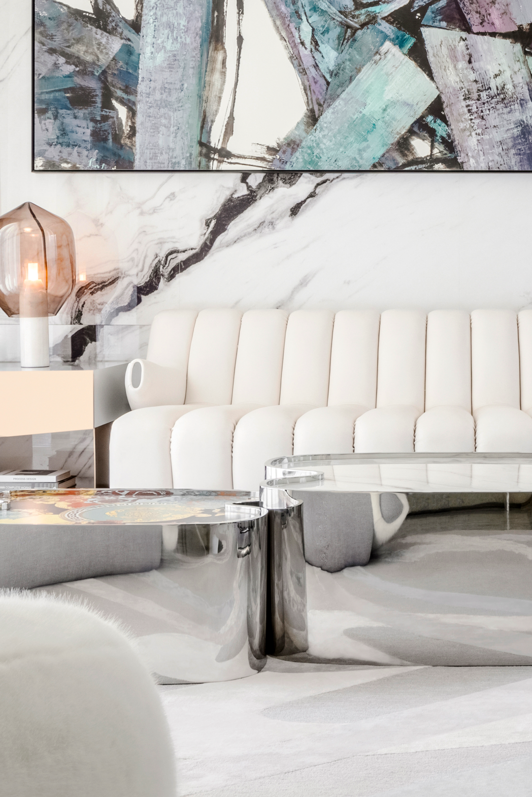 自水吧看向玄关,大理石条几成为客厅的对景,与地面纹理相匹配。玄关顶部造型与地面「湍急的水」彼此呼应