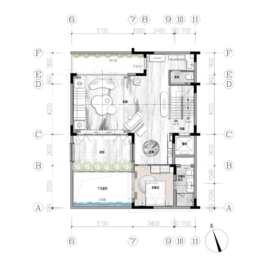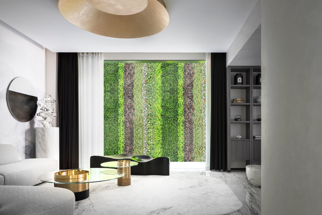 用两面对望的墙体统领了整个别墅:两层高的水幕墙和三层高的植生墙。下沉庭院的存在补足了室内缺失的挑空,背倚瀑布、坐望草木,我把遨游山水间的空灵感受连同自然光归还别墅。