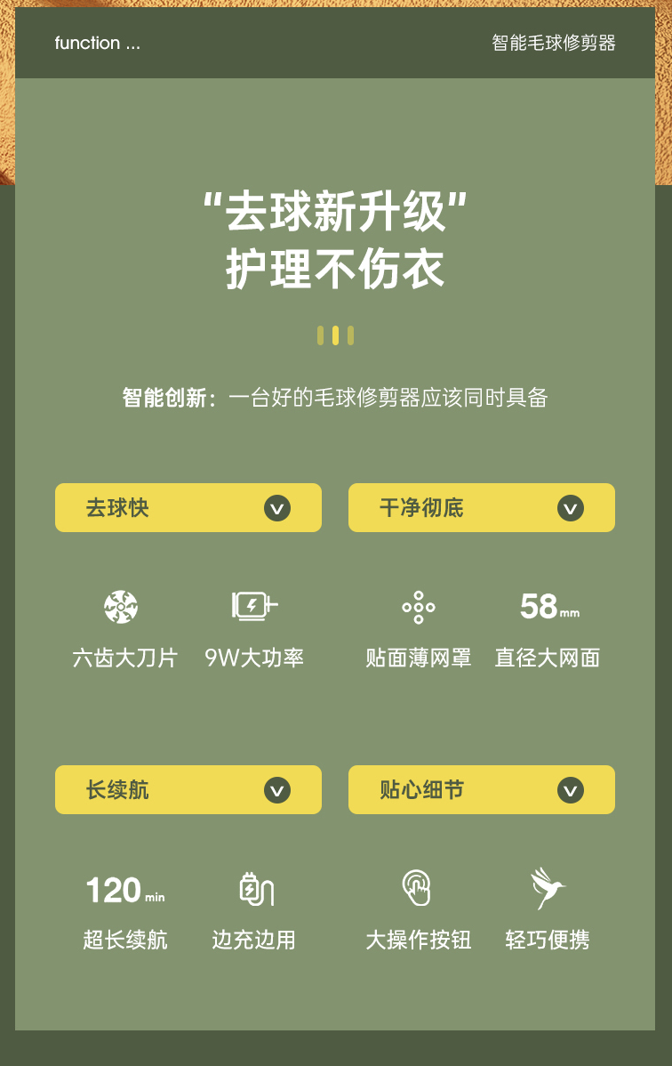 隐藏式的不锈钢刀片,有着6叶锋利刀头,剔除毛球速度快到看不见!操作便捷又彻底,三下两除二,旧衣变新衣!过程超级治愈!