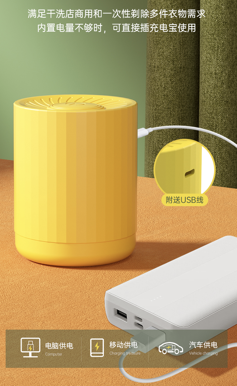 如果家里待处理的衣物太多,电量耗尽也没关系,插上充电宝即可边充电边工作,也避免了反复充电的烦神操作。