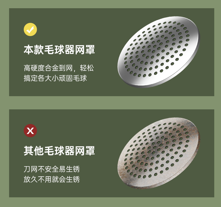 此外,轻薄如纱的弧形网罩设计,能在使用时灵活贴合异物,最大程度减少毛线纠扯衣物,真正做到剃毛不伤衣服。