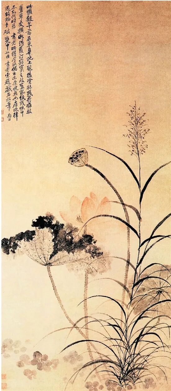 《荷花芦草图》,立轴,纸本设色,纵131.3厘米,横59.7厘米,南京博物院藏。此图描绘的是秋天景色。画的正中是一枝新荷亭亭玉立,在秋风飒飒中挺立怒放,盛开的花瓣娇艳动人,显示出卓然不群的秀美风姿,如明代诗人李之世《赋得秋荷》中“盆荷秋欲尽,偏放一枝奇”之诗句。荷花是以恽寿平特有的没骨画法绘出,色调清丽冷艳,用笔洒脱飘逸,营造出一派宁静渺远、空潆清新的韵味。其左侧是一片凋残半枯的荷叶,满满的沧桑感;其右下方也有一片荷叶,正值风华正茂之时。荷花的右侧一枝半弯枯色的荷茎尽管老迈龙钟,仍然不屈地昂起,孤零零地撑起一朵枯槁无色的莲蓬,蓬眼黑幽,老气横秋。