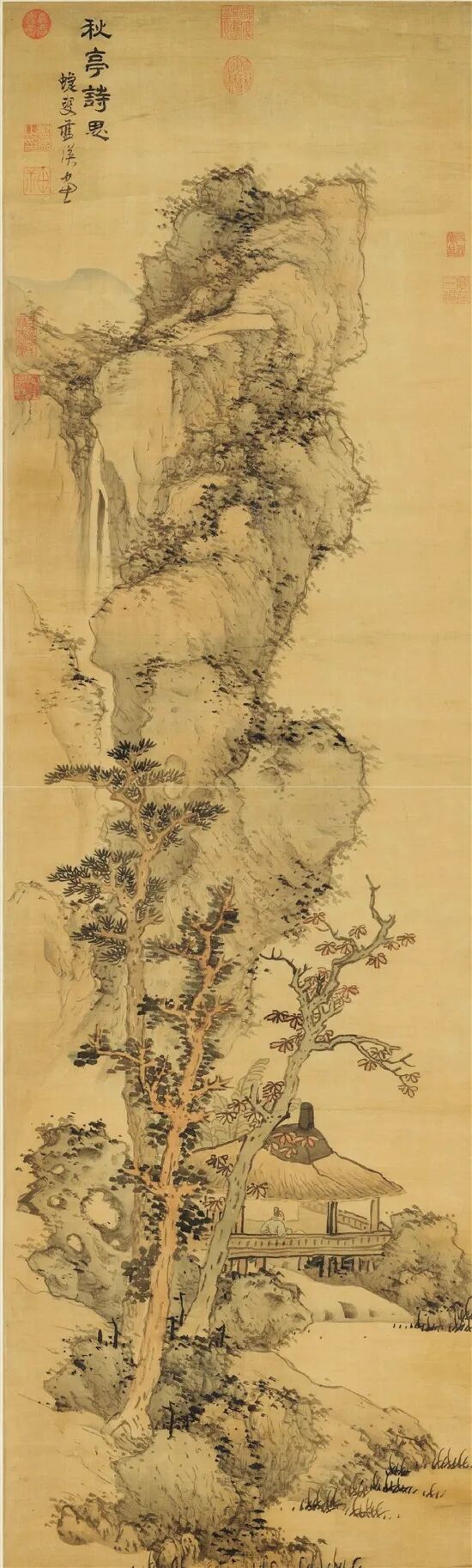 明代著名画家蓝瑛《秋亭诗思图》,就是这样一幅具有诗情画意的作品。该作品绢本立轴、设色,169.3×51.8厘米,现藏于台北故宫博物院,是一幅流传有序描绘秋景的珍品。