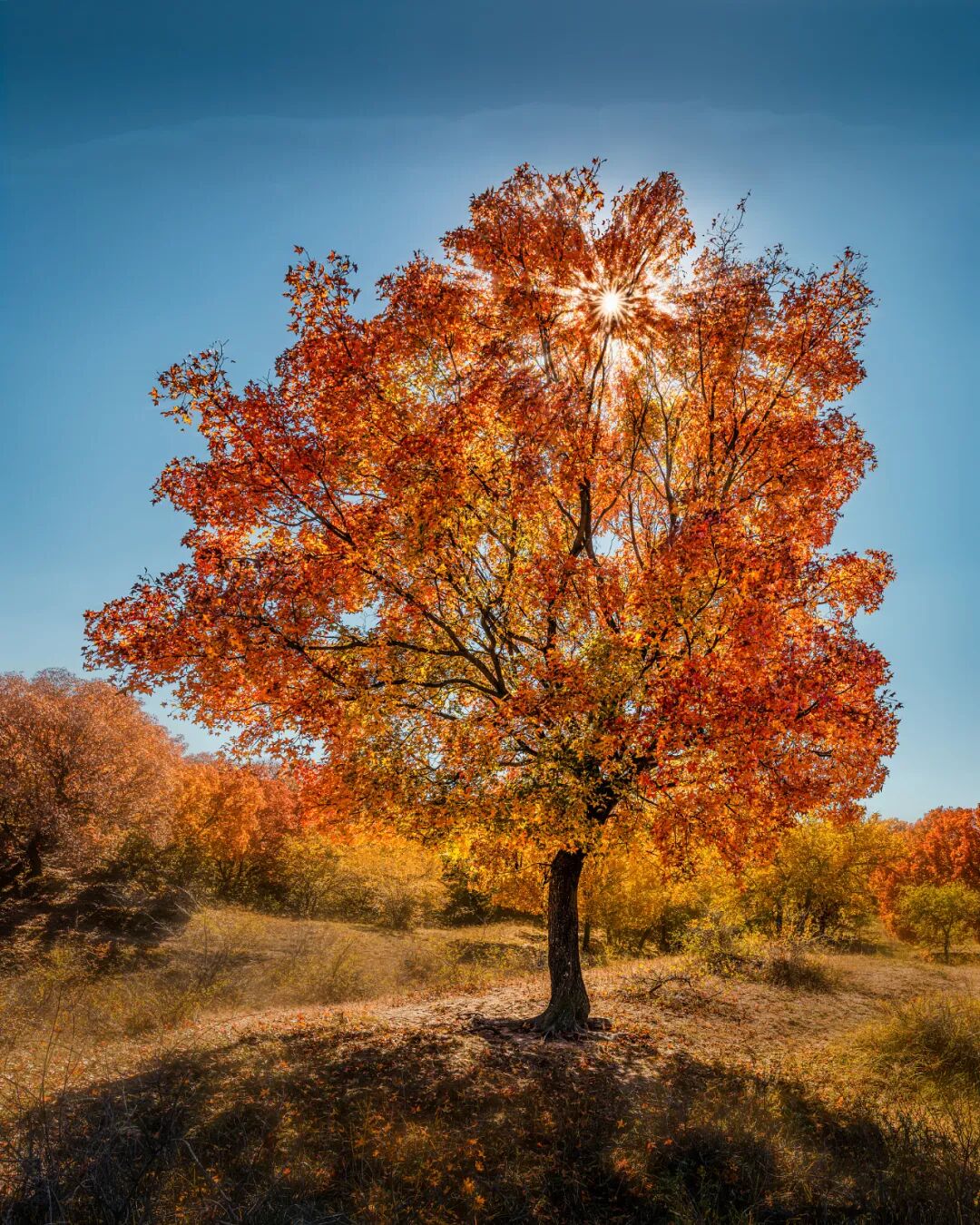 而在大兴安岭南侧的科尔沁沙地腹地,也有别有一番风味的秋色。在通辽市一带,生长着濒危稀有树种沙地五角枫,这种神奇的树种能够适应严酷的自然环境,而且有着别致的绝美之姿,本该萧瑟悲凉的秋天在五角枫的点缀下显得一片缤纷。