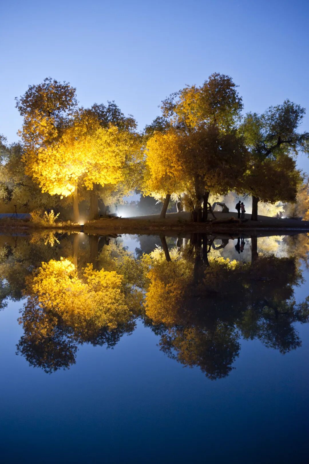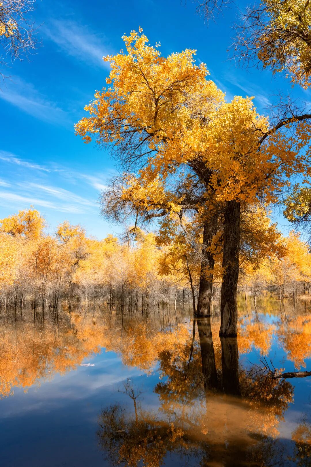 胡杨树不仅有着极强的生命力,更是有着极致的风姿。每年9月20日-10月20日,是胡杨林景色最美的时段,此时尚未凛冽的寒气和阳光将金色镀在每一棵各具姿态的胡杨树上,满地的金色落叶如同斑斓温暖的地毯。蓝天、溪水与金色胡杨一起倒映在湛蓝的溪水中,是这里举世罕见的秋时奇景。