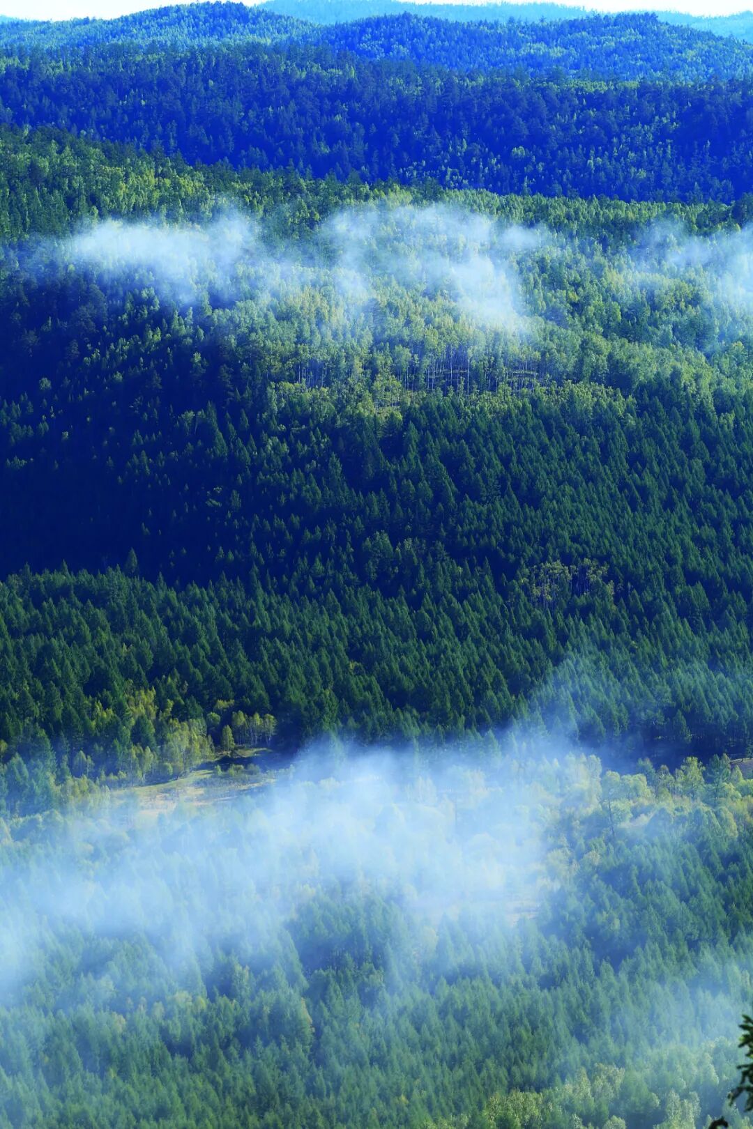 一片片松树、白桦莽莽苍苍,在波浪状的缓丘间碧波万顷,俨然一片望不到尽头的绿色海洋。如若置身其间,浑然不知这里的山究竟有多高,林究竟有多密,有的只是一片又一片林海、一道又一道云雾罢了。