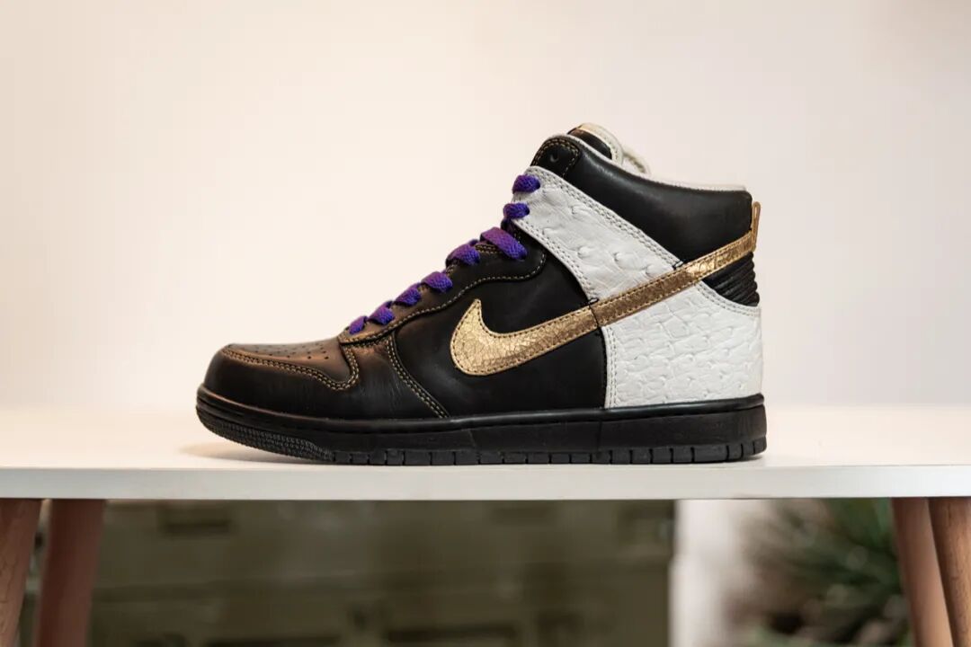 2008年,Nike携手来自纽约的女性街头服饰品牌 Married to the Mob 合作推出了这双具有奢侈品风格的 Dunk High 。整双鞋由黑色漆皮搭配白色仿羔皮(Boucle Fabric)拼接而成,并且在鞋舌,鞋带扣均加入了品牌 Logo,每只鞋还配有两个金属挂饰,彰显联名身份。以上几个元素的搭配不禁让人联想到了用料高昂的女士大衣或鞋靴,而这双鞋的发售价也远高于普通的 Dunk High,达到了150刀。