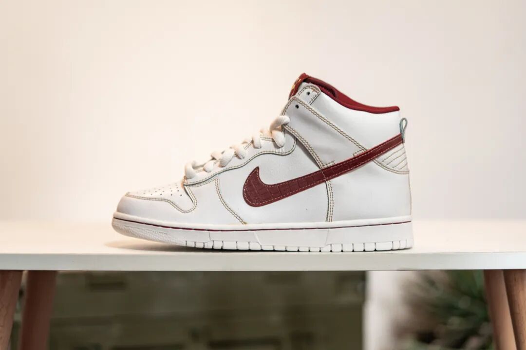 高帮款鞋身整体材质为白色漆皮,搭配酒红色仿蜥蜴皮质感的 Swoosh,在鞋舌,内衬以及中底车缝线等部分也都使用了酒红色,而鞋身则是使用了米色的车缝线。鞋舌的标志代表着莺尾花,这一元素在黑帮成员佩戴的领带上经常出现。