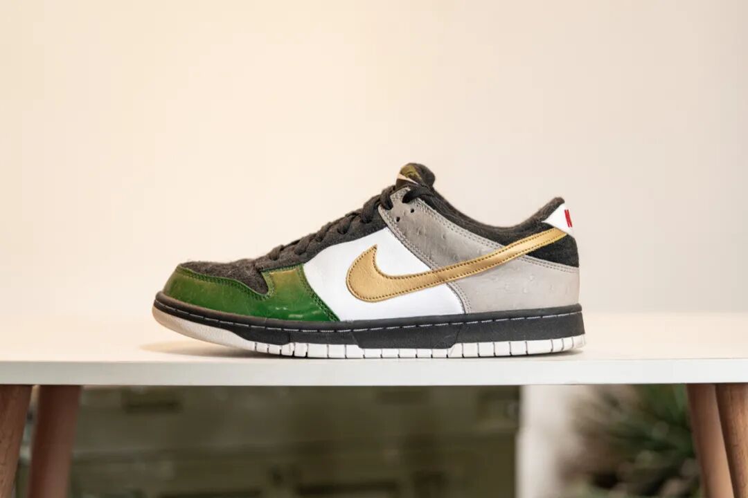 说回本部分的主角,不少人会认为这一双 Dunk Low 的配色灵感来源于日本著名球鞋店铺 Mita Sneaker 与 Nike 在2004年合作推出的 Air Force 1 "温故知新" 。这双鞋以材质的多样性以及其标志性的黑、白、绿、金色间的搭配而著称。但更严谨的说,这双 Dunk Low 的真正配色灵感还是源自当年的一双 SAMPLE 版本,也就是下图中间的这一双。