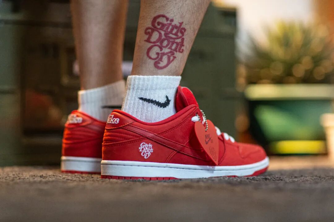 双方的首次联名采用了 SB Dunk Low 这一鞋款,也是与 Verdy 本人深受滑板文化影响有关。外观方面,两款鞋分别以全白与全红示人,红白两色也是 Girls Don't Cry 的标志色,与情人节主题的配色十分相似。