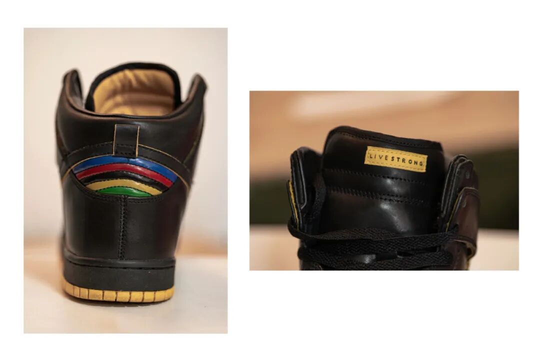 2010年,为纪念前自行车选手 Lance Armstrong 最后一次参加环法大赛,Nike 与他创办的基金会 LIVESTRONG 再一次推出以 Dunk High Premium 为蓝本的合作鞋款。配色是黑色与代表 LIVESTRONG 系列的亮黄色之间的搭配,但鞋身大部分被黑色覆盖,仅在后跟部分加入了小面积的色彩元素,与冠军的彩条衫颜色相同。另外在鞋舌上,我们依然可以发现标志性的 LIVESTRONG 的方块形 Logo。这双鞋的风格相对低调,但依然可以让人较为明显地识别出配色主题。