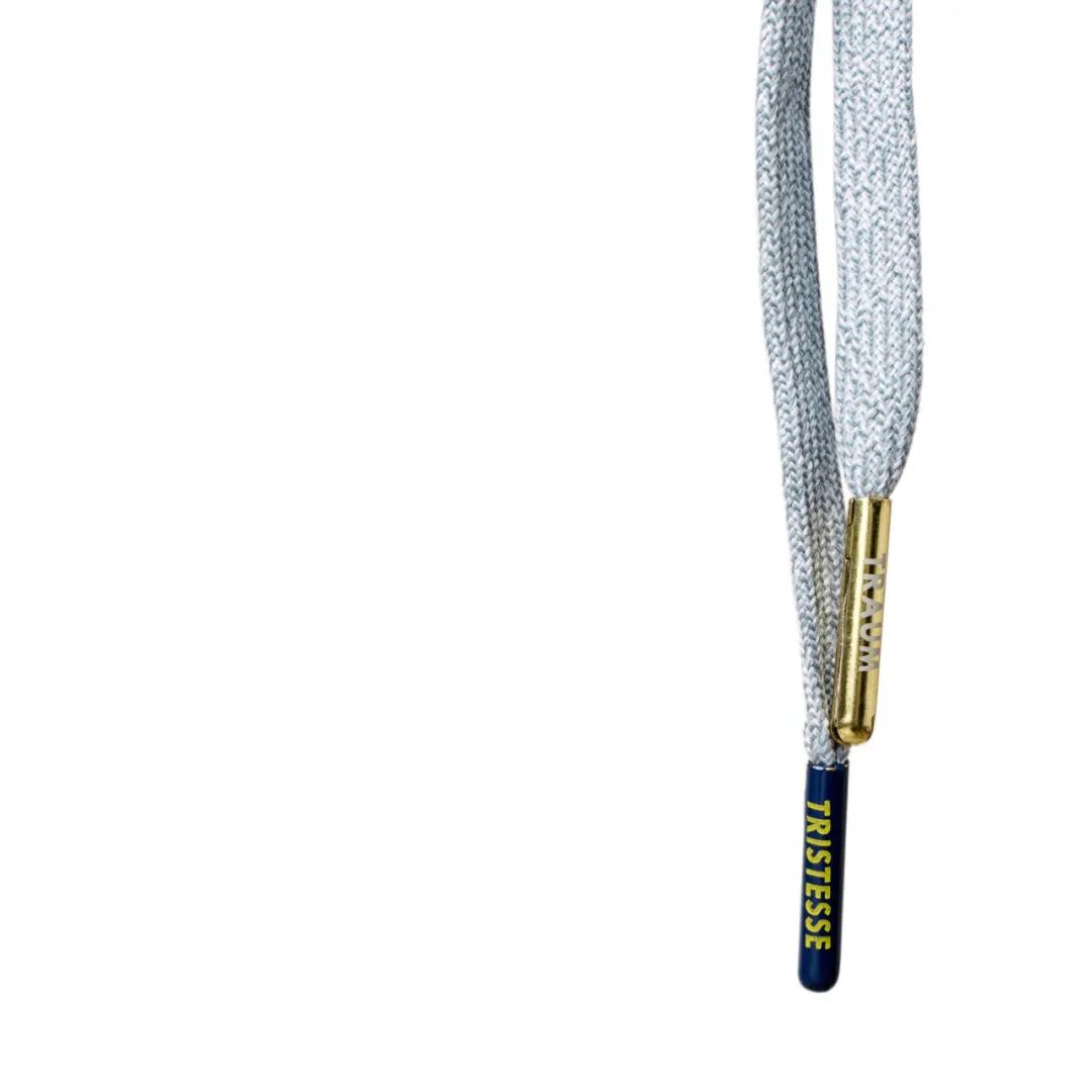 回到鞋本身,鞋身与中底外底全部被灰色覆盖,象征着板楼墙体的颜色,而鞋面蚀刻出的方块就像是板楼墙面上的砖块。蓝色和金色的鞋带头分别印着「TRITESSE」与「TRAUM」,分别代表悲伤与梦想,这两个元素也是共存于柏林这座城市。当人们系上鞋带,也就会联想到二者交织在一起。