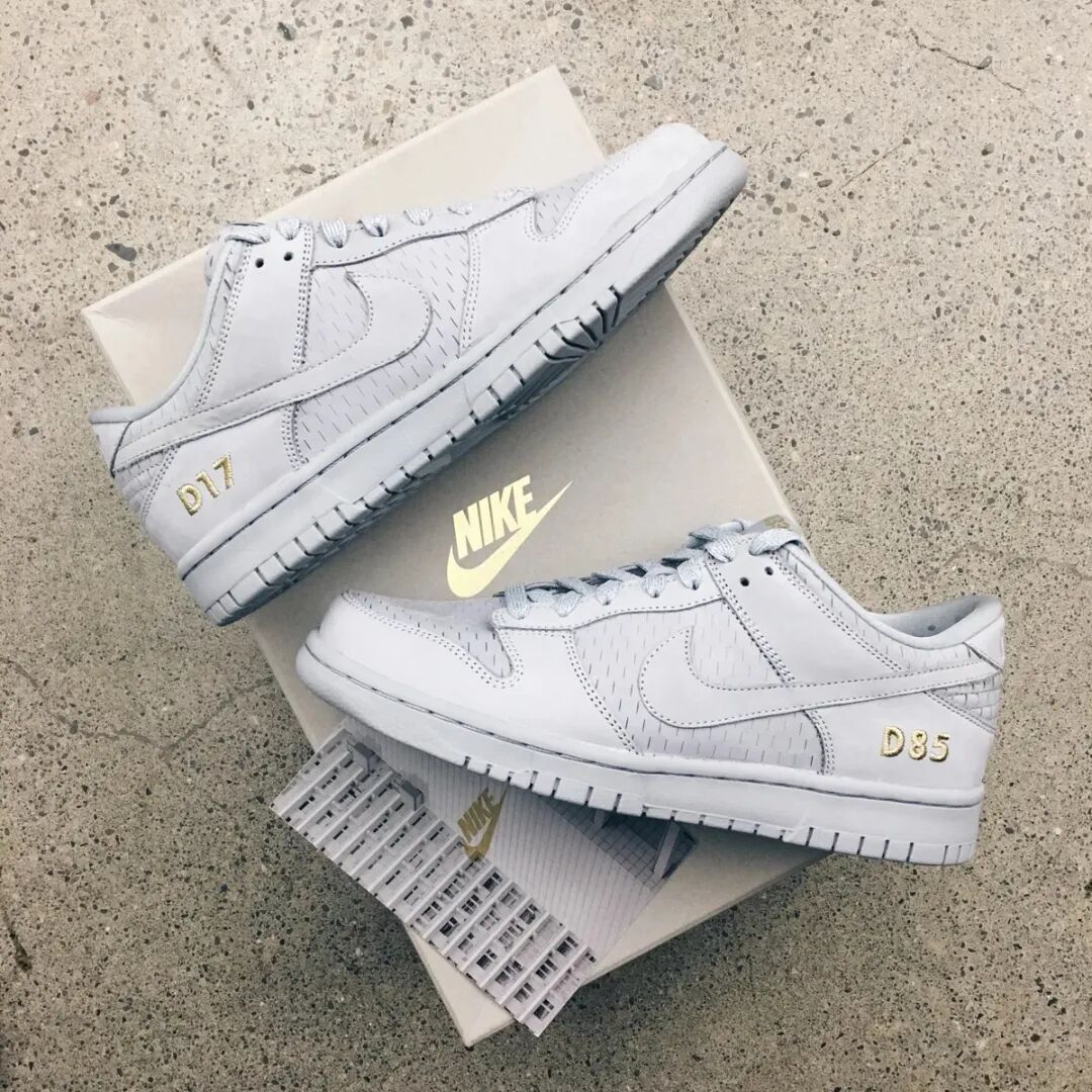后跟压印以及金色刺绣D85 D17代表:最初 Nike Dunk 发售的年份1985年与这款鞋的发售年份2017年。