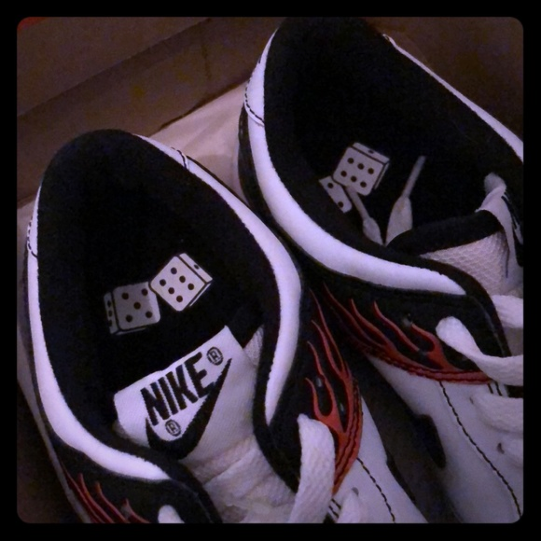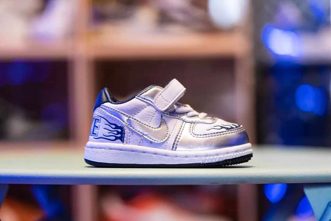 其次是这双 Little Terminator Low 的 Sample 版本,在鞋头以及后跟部分同样加入了火焰图案,但整体以黑、白、银为主色调,与前者并不属于同一系列。