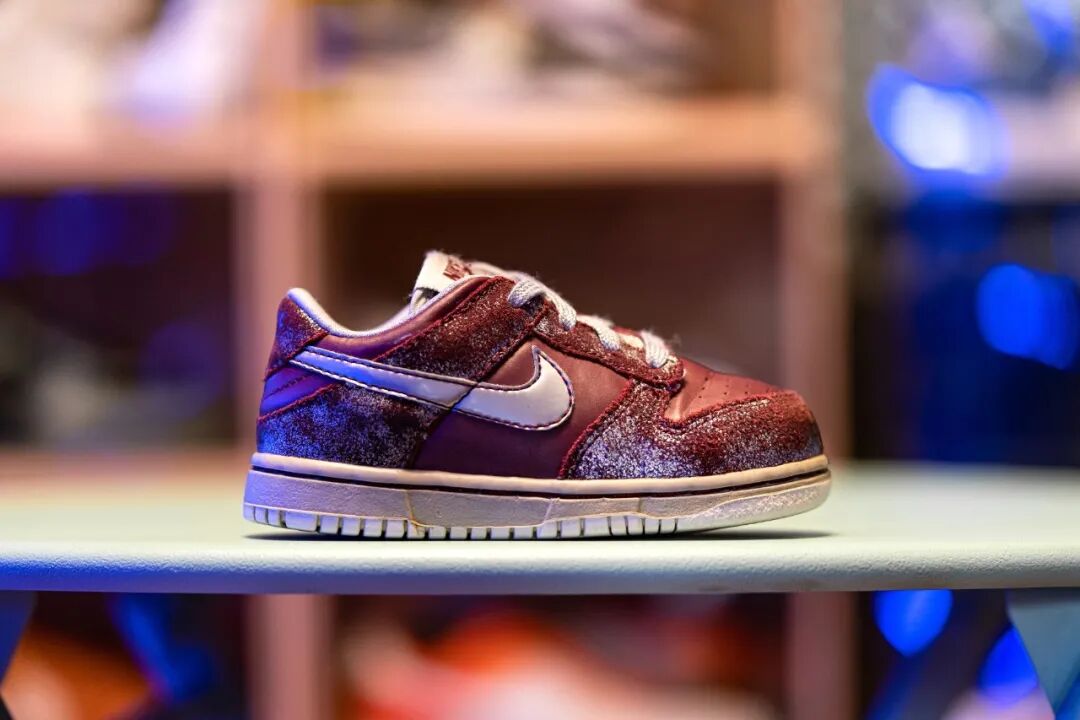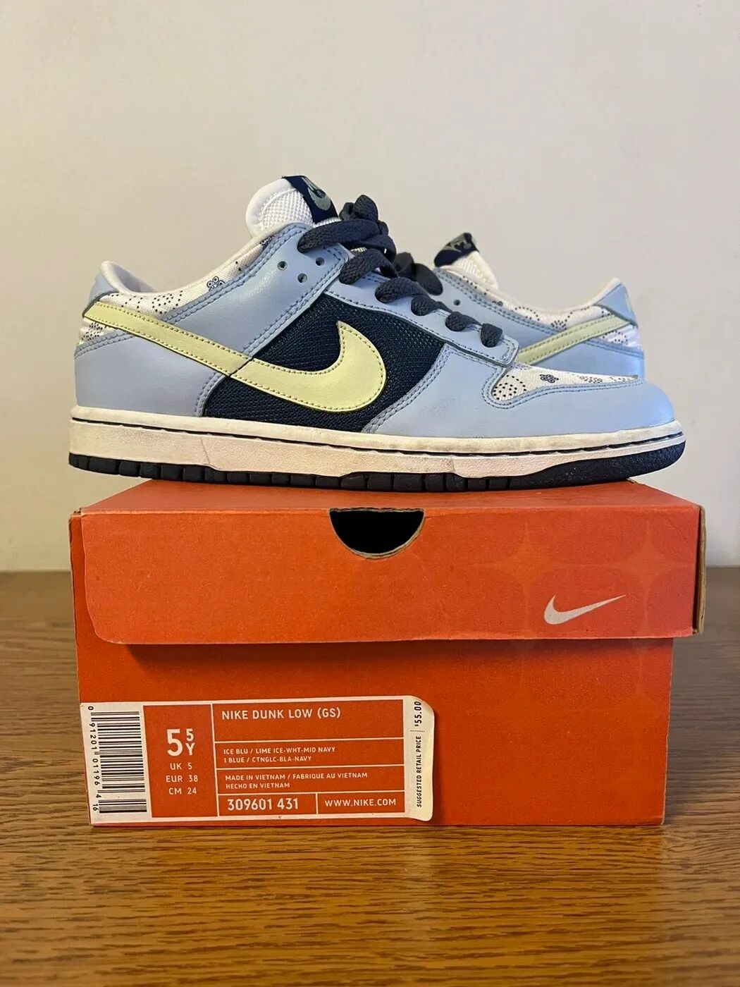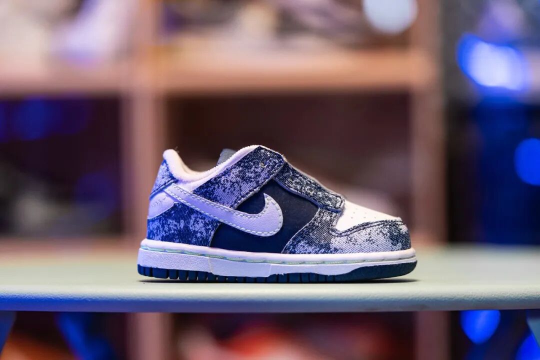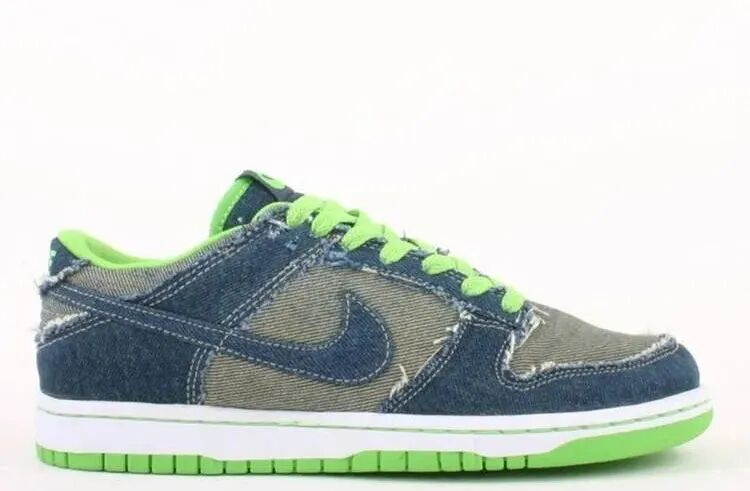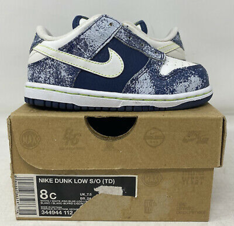于2004年发售的丹宁材质的 Dunk Low,尺码范围最大同样只到 GS。这款鞋的整体材质选用以及在走线处破坏的处理很容易让人联想到于2002年发售的 Dunk SB Low "Reese Forbes",二者有异曲同工之妙。而湿远能找到这双来自18年前的童鞋版本也实属不易。
