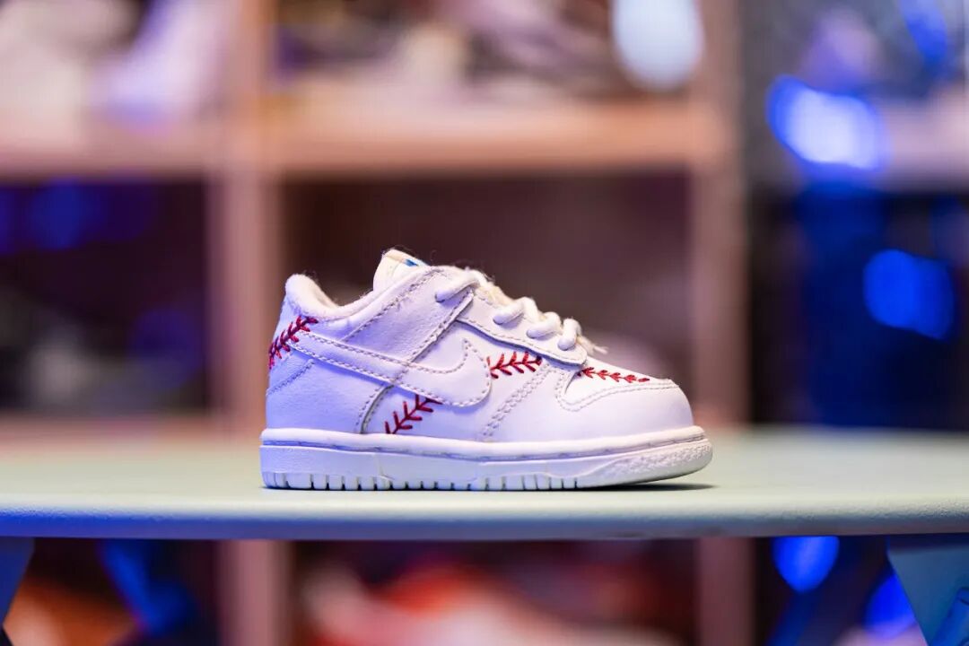 将二者放在一起介绍也是因为它们都包含了棒球元素,但需要特别说明的是:左图的款式为 Nike 在2019年以篮球、棒球与网球为灵感而推出的一款 AF1,仅覆盖 GS 与儿童尺码。右图的 Dunk Low 则是于2008年推出的棒球配色,尺码范围与前者相同。